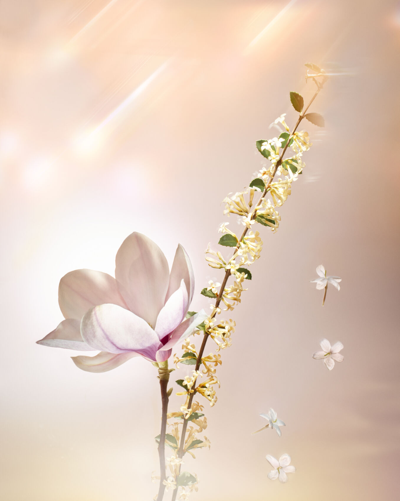 A serene composition features a large pink flower with delicate petals alongside a slender branch adorned with cream-colored blossoms. Scattered smaller flowers appear to float gently amidst soft, warm light creating a dreamy atmosphere. Hues of pink, cream, and gold blend seamlessly, evoking an ethereal and tranquil scene reminiscent of a quiet, elegant morning.