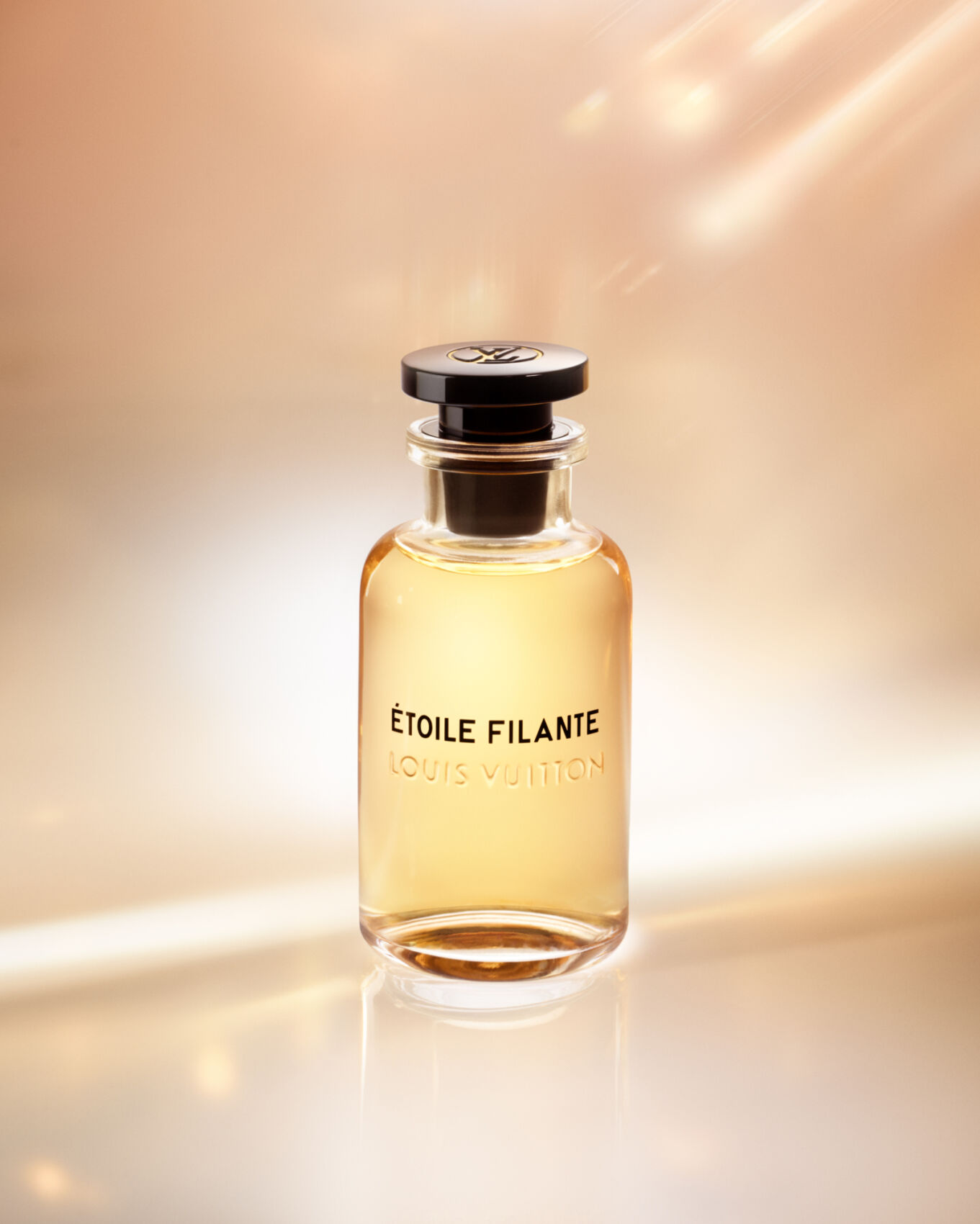A sleek, transparent bottle stands centrally against a gradient background of soft blues and whites, creating an ethereal atmosphere. Light reflects off the bottle's smooth surface, highlighting its elegant curvature and the shiny, metallic black cap. The overall impression is one of sophistication and modern luxury, with a calming, almost celestial ambiance.
