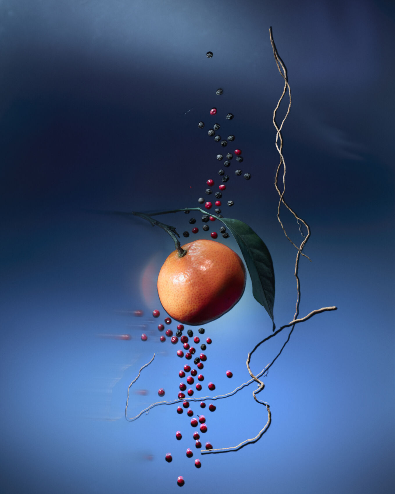 A vibrant orange fruit with a glossy leaf is suspended in mid-air against a deep blue backdrop. Surrounding the fruit, small red and black spheres cascade downward. Two delicate, twisting branches frame the surreal composition, adding a touch of nature's elegance. The play of colors creates a dynamic, ethereal visual reminiscent of floating elements in space.