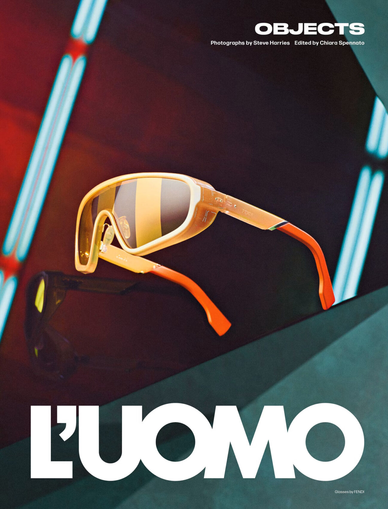 A pair of stylish sunglasses with orange-tinted frames and lenses is prominently displayed. The background features a series of futuristic, diagonal light bars in blue and red hues, creating a dynamic, modern aesthetic. The overall composition focuses on showcasing the sunglasses as a fashion accessory, emphasizing their vibrant colors and contemporary design.