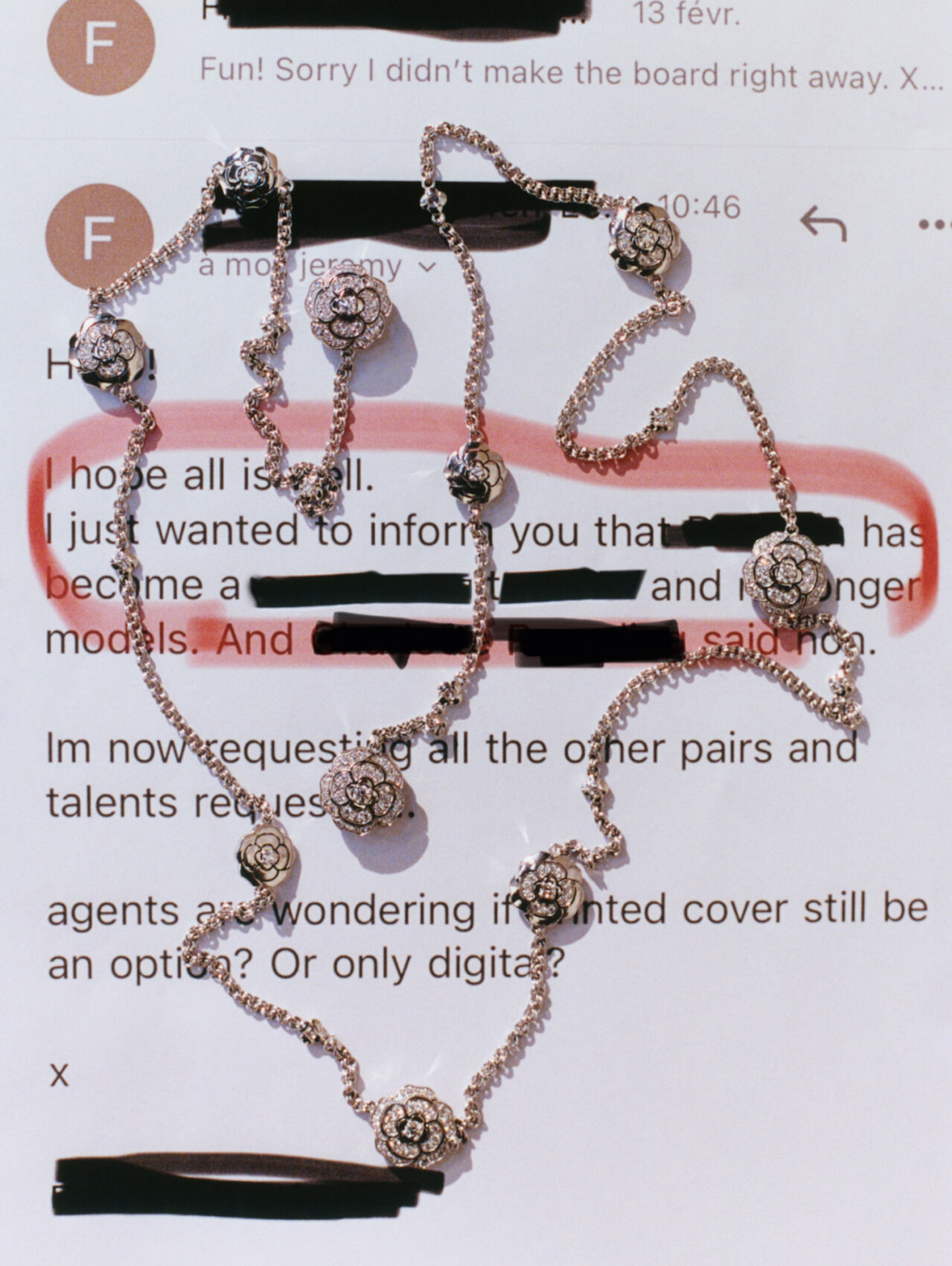 A delicate, gold chain with ornate, flower-shaped pendants is gracefully draped across a background with partially obscured text. The elegant chain and floral designs shine brightly, contrasting with the darker elements around them. The lines of text beneath appear partially redacted, emphasizing the intricate jewelry as the focal point against the blurred textual backdrop.