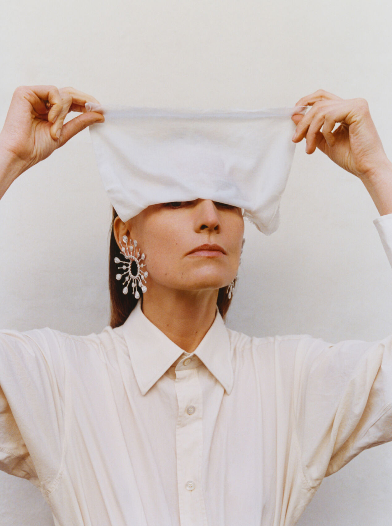 A person stands against a neutral background, wearing a light-colored, collared shirt. Large, ornate earrings add a glamorous touch. Their arms are raised, holding a white cloth over their eyes, creating a sense of elegance and mystery. The expression is serene and poised, emphasizing a unique blend of fashion and artistic expression.