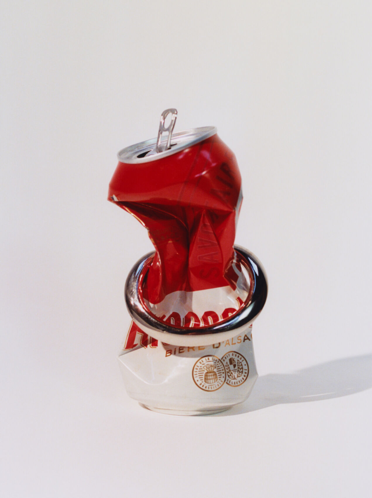 A crumpled red and white aluminum can is artistically pierced by a shiny metal ring. The can, partially squashed, stands upright on a plain surface. The juxtaposition of the crushed texture and smooth, reflective ring creates an intriguing visual contrast. Light and shadow interplay highlights the can's creases and the ring's sleek surface, adding depth.