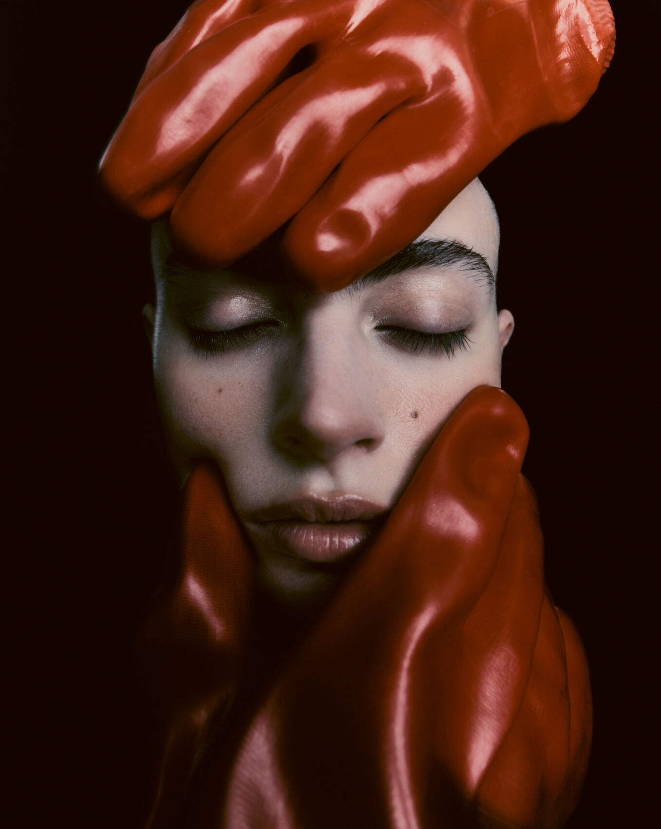 A serene face is encased by three pairs of shiny red gloves. Closed eyes suggest tranquility or introspection, while the gloves create a striking contrast with the soft features. The positioning of the hands defines the composition, adding a dramatic visual element. The color palette consists mostly of reds and muted skin tones, set against a dark background.