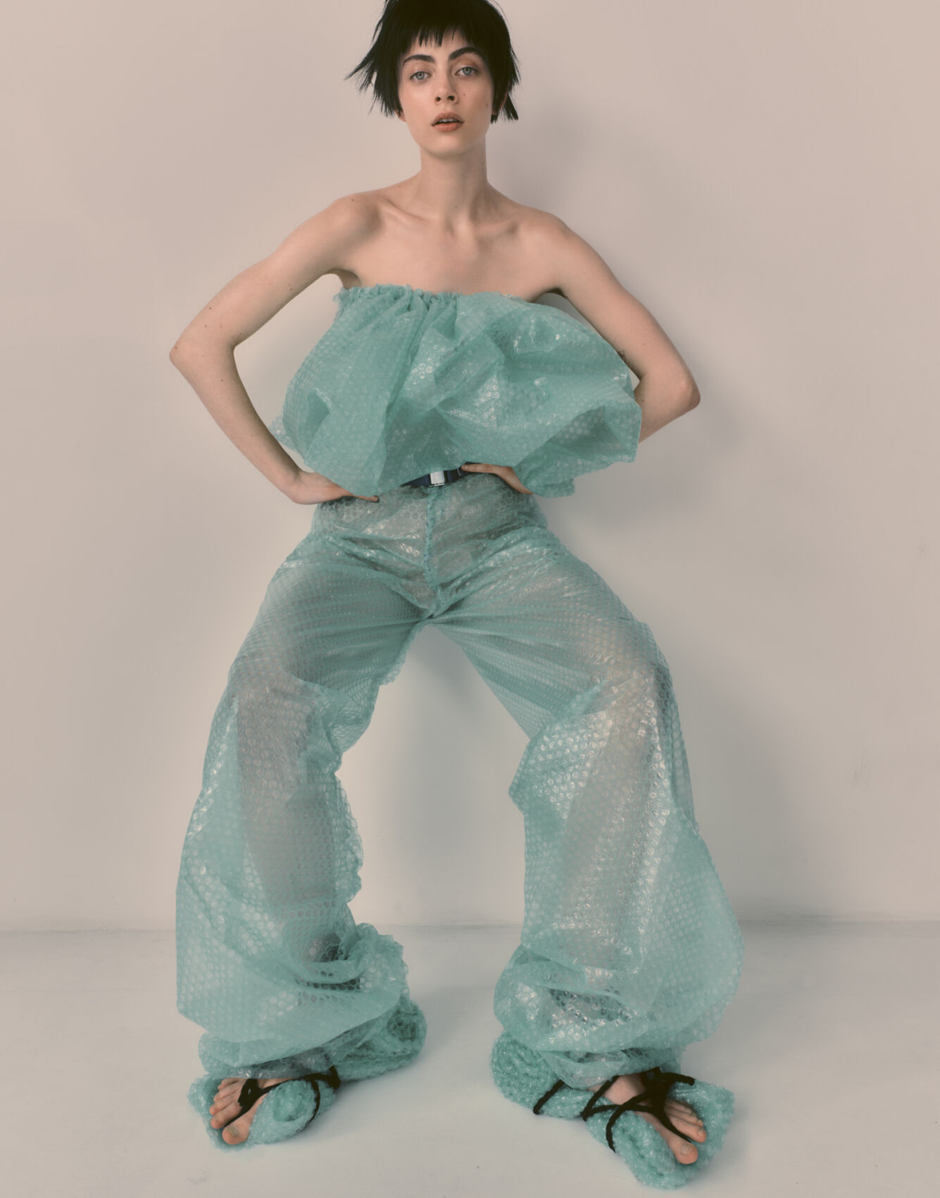 A person with short dark hair stands confidently against a plain background, wearing an unconventional outfit made entirely from transparent bubble wrap. The ensemble includes a voluminous top and wide-legged pants, accentuated by matching footwear. The pose and clothing evoke a sense of avant-garde fashion, blending elements of whimsy and innovation in design with a playful twist.