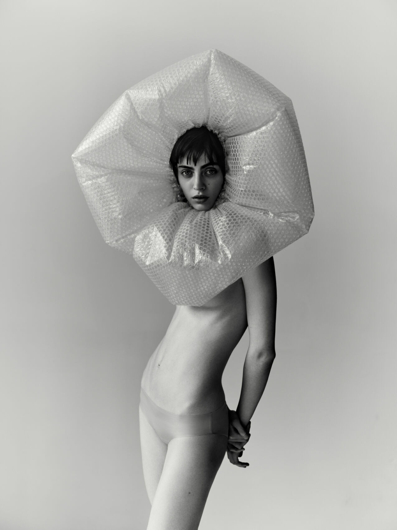 A person stands against a plain background, adorned with a unique headpiece crafted from bubble wrap, giving a dramatic, avant-garde look. Their short hair complements the minimalist style, and the bare torso is slightly turned, creating dynamic lines. The overall composition is striking, combining fashion-forward creativity with a touch of surrealism.