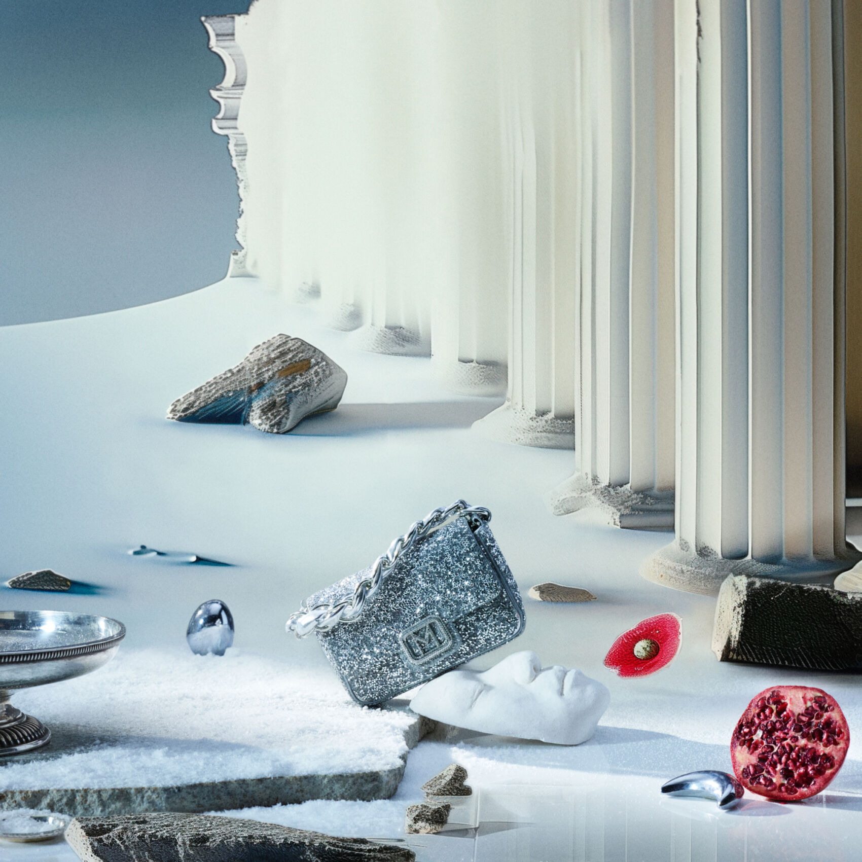 A surreal scene depicts a snowy landscape with ancient columns, scattered stone fragments, and a silver metallic handbag. A serene marble face rests on the ground among various objects, including a halved pomegranate and a reflective sphere. The setting combines classical and contemporary elements, merging them into a dreamlike composition with a mystical, icy atmosphere.