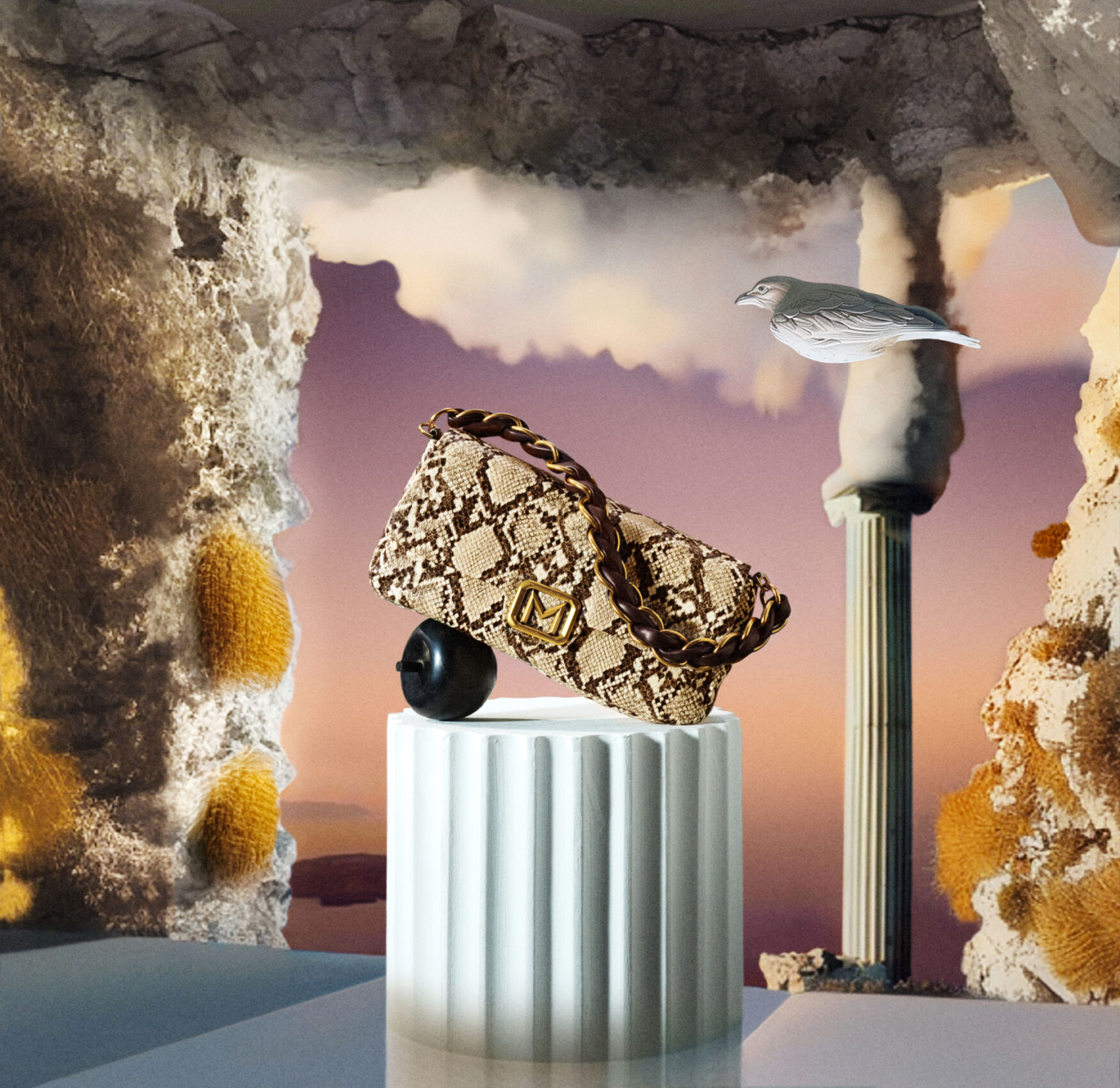 A beautifully patterned bag with a snake-like texture and a prominent gold accent rests on a cylindrical pedestal. The background features a surreal landscape with stone formations and a column-like structure. The scene includes a bird gliding gracefully, enhancing the whimsical atmosphere with the soft hues of a sunset creating a dream-like setting.