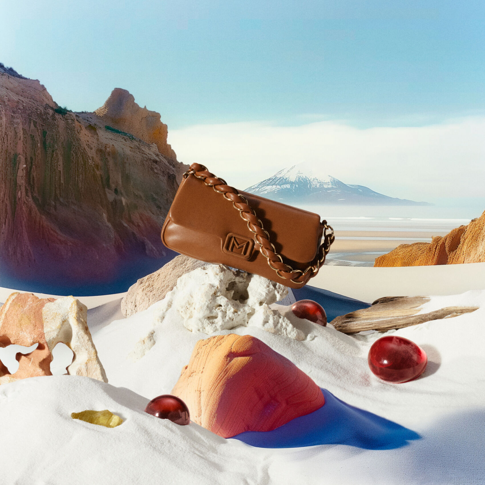 A brown leather handbag with a chain strap is artfully positioned atop a smooth, white sand dune. The setting features red rock formations in the background and scattered spherical stones. The sky is clear, providing a serene and contrasting backdrop that highlights the bag's elegant design, creating a fusion of fashion and nature's beauty.