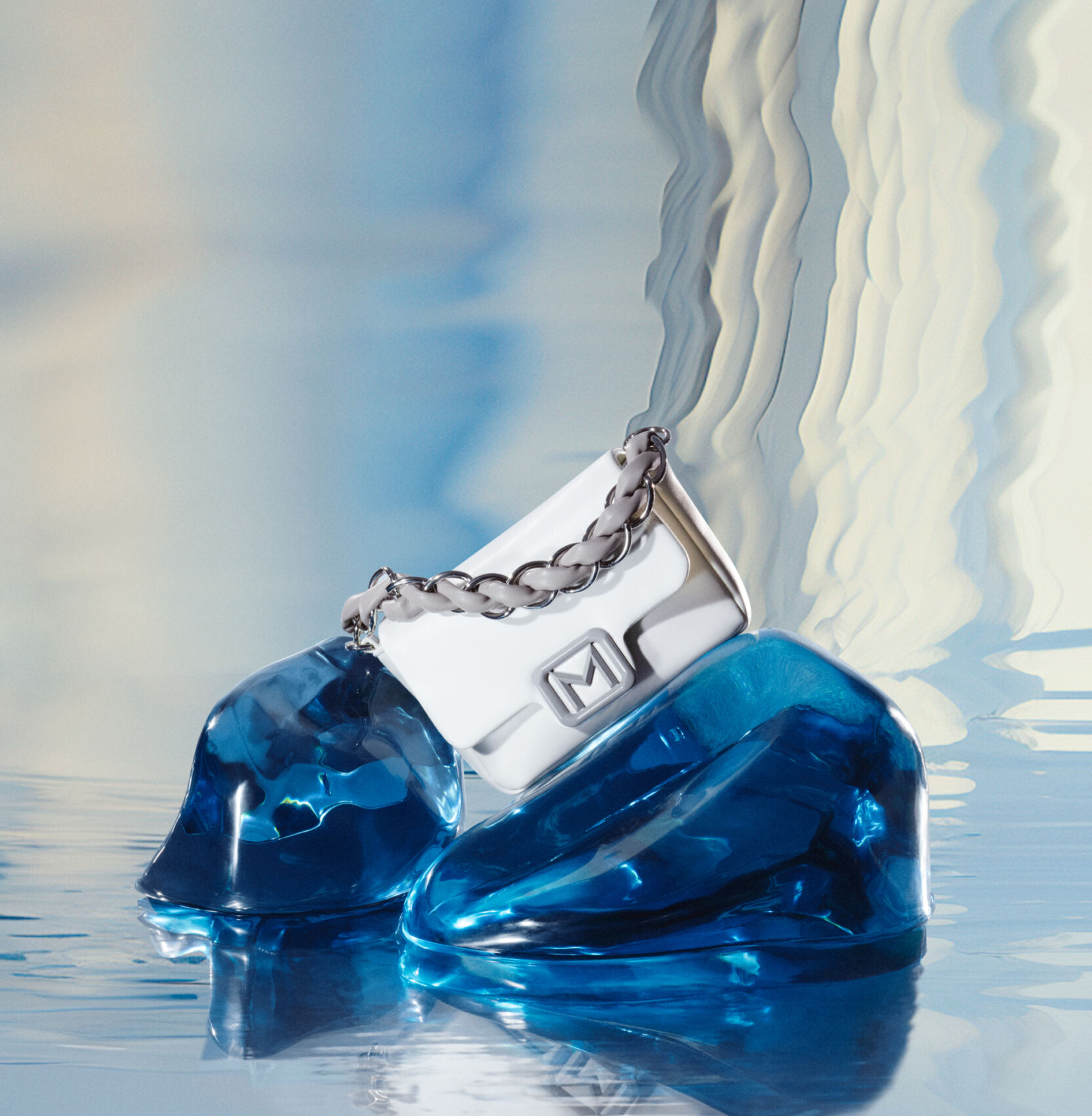 A sleek, silver-colored accessory with a chain handle is artfully positioned atop glossy, blue crystalline shapes. The background displays a gradient of soft, flowing hues, blending from blue to cream, creating a tranquil, reflective ambiance. The overall composition conveys elegance and modernity through the fusion of metallic elements and vibrant, translucent forms.
