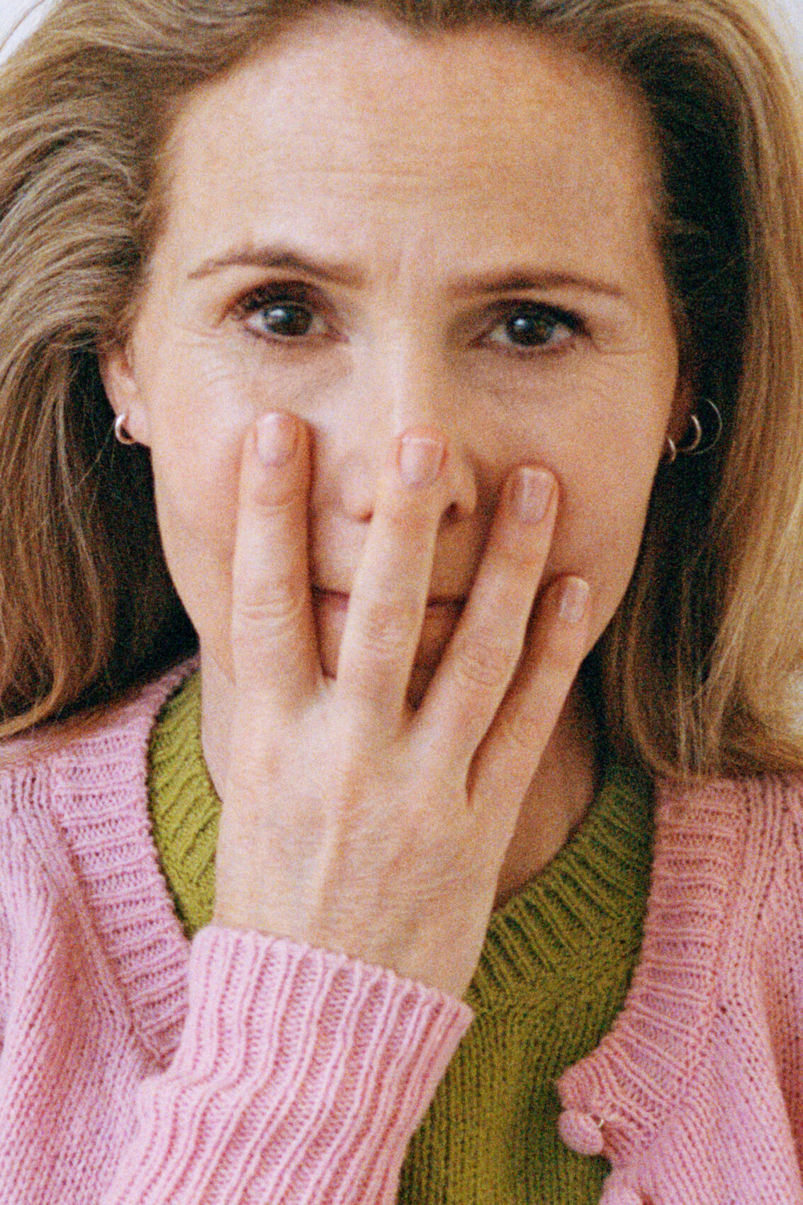 A person with light hair wearing a pink sweater over a green top partially covers their face with their hand, revealing only the upper part of their face and eyes. The fingers, adorned with a subtle sheen, create an intriguing barrier. Small hoop earrings accentuate the ears, adding a touch of elegance to the casual attire.