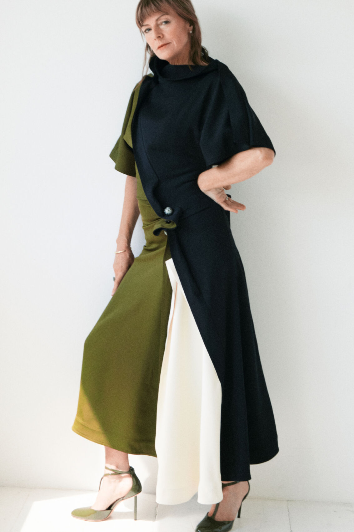 A person stands against a light-colored wall, wearing a stylish, asymmetrical dress with green, blue, and white panels. The dress has a high neckline and a prominent button detail at the waist. They are wearing matching green high heels. Their hair is styled simply, and they have a poised and confident expression.