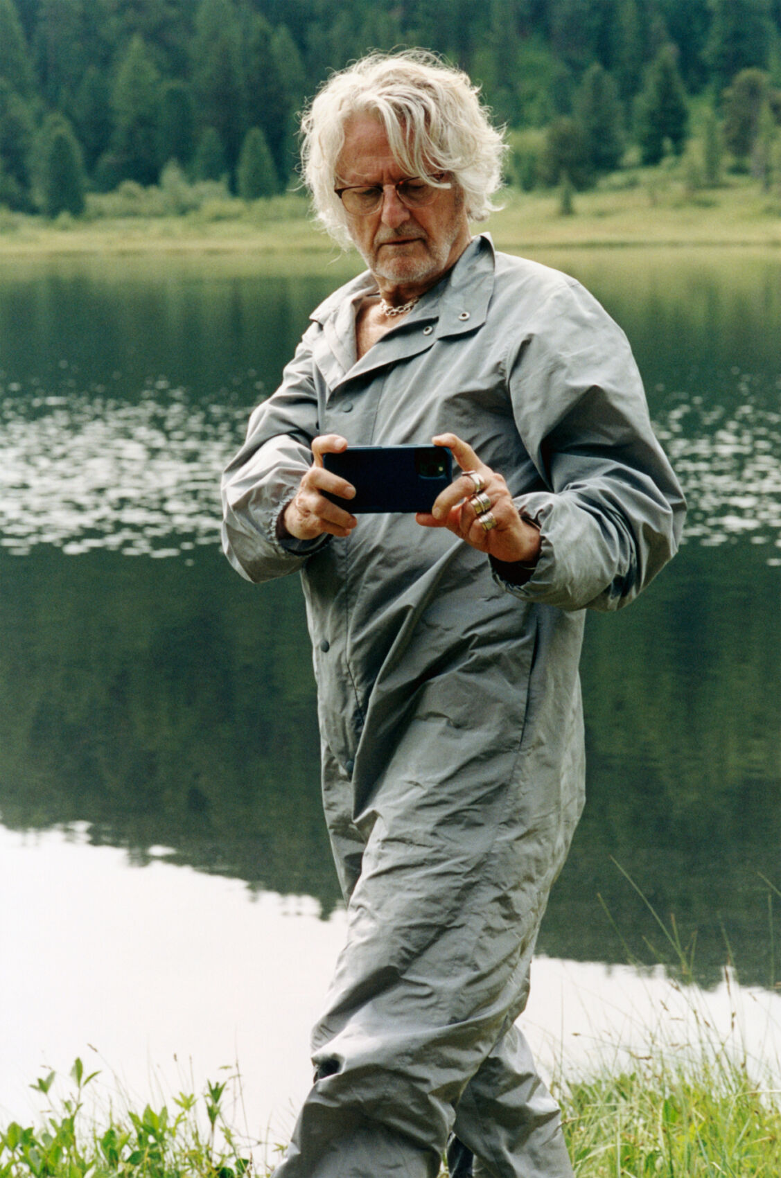 An older individual with white hair and glasses is outdoors, wearing a gray jacket. They are holding a smartphone with both hands, seemingly capturing a moment. In the background, a serene lake reflects the lush green forest surrounding it. The scene suggests a peaceful, natural setting with a focus on technology amidst nature.