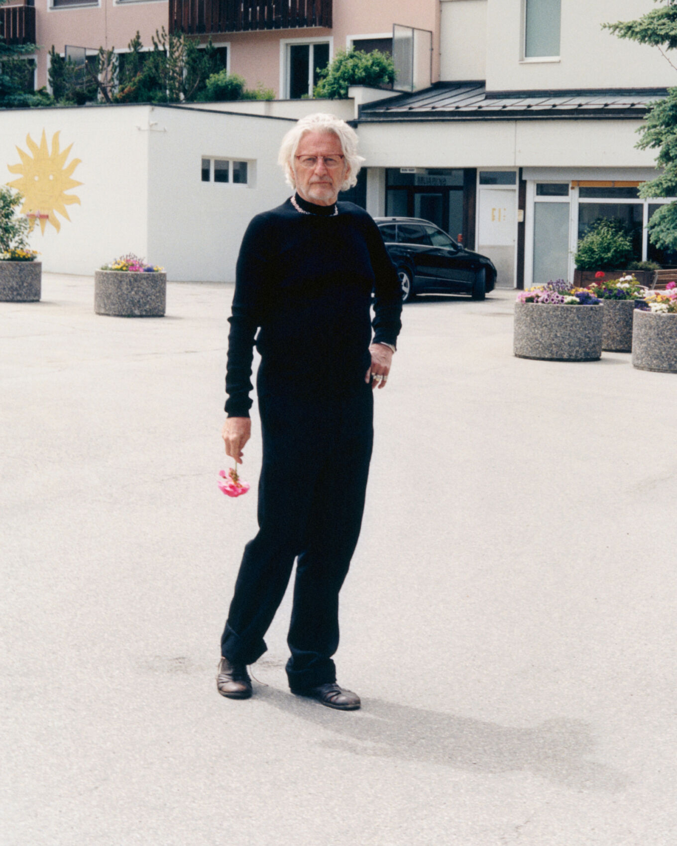 An older man with white hair and glasses stands on a paved area, dressed in black. He holds a small pink object in his hand. Behind him, there are modern buildings adorned with greenery, flower pots, and a parked car. The environment appears calm, with pastel-colored walls and a large cheerful illustration nearby.