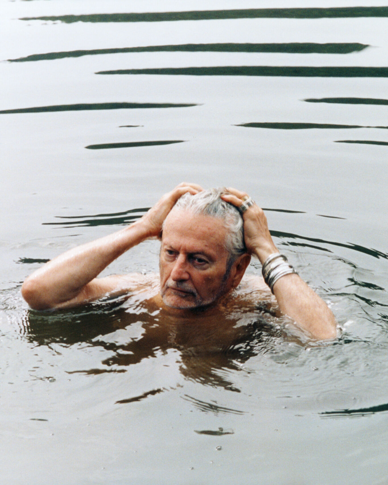 An elderly man stands in the calm waters, with his hands clasping his head, revealing a thoughtful or introspective expression. He wears multiple rings and a bracelet, suggesting a fondness for accessories. The water reflects the play of light on its surface, creating a serene backdrop. The overall mood suggests contemplation or a moment of quiet reflection.