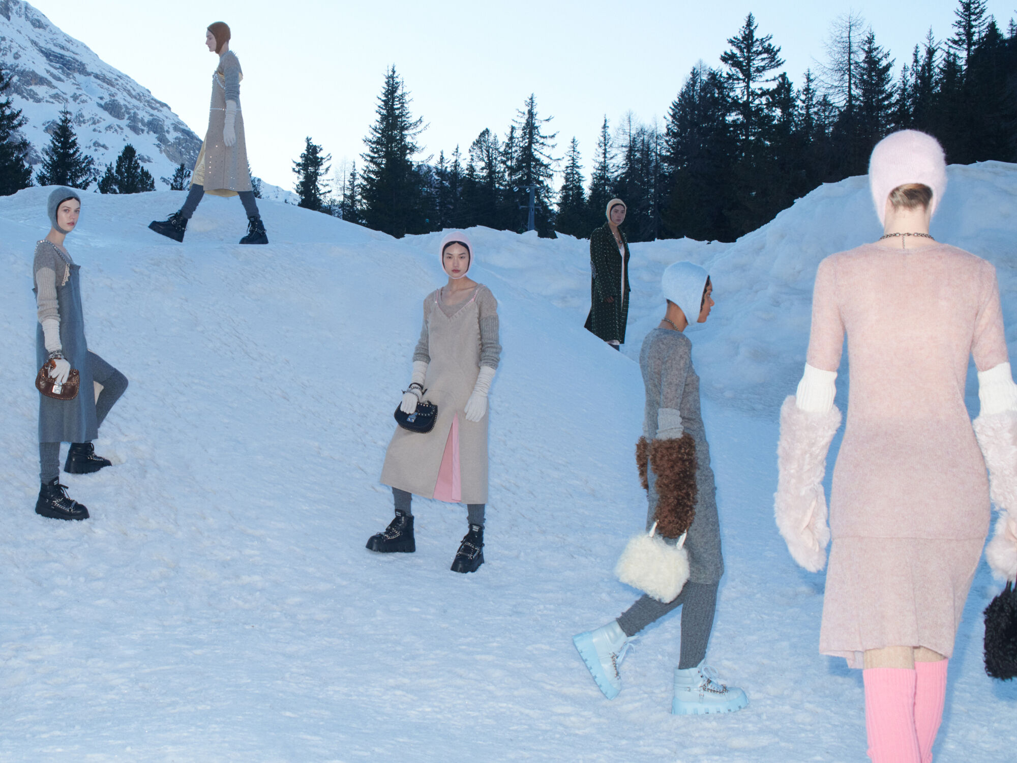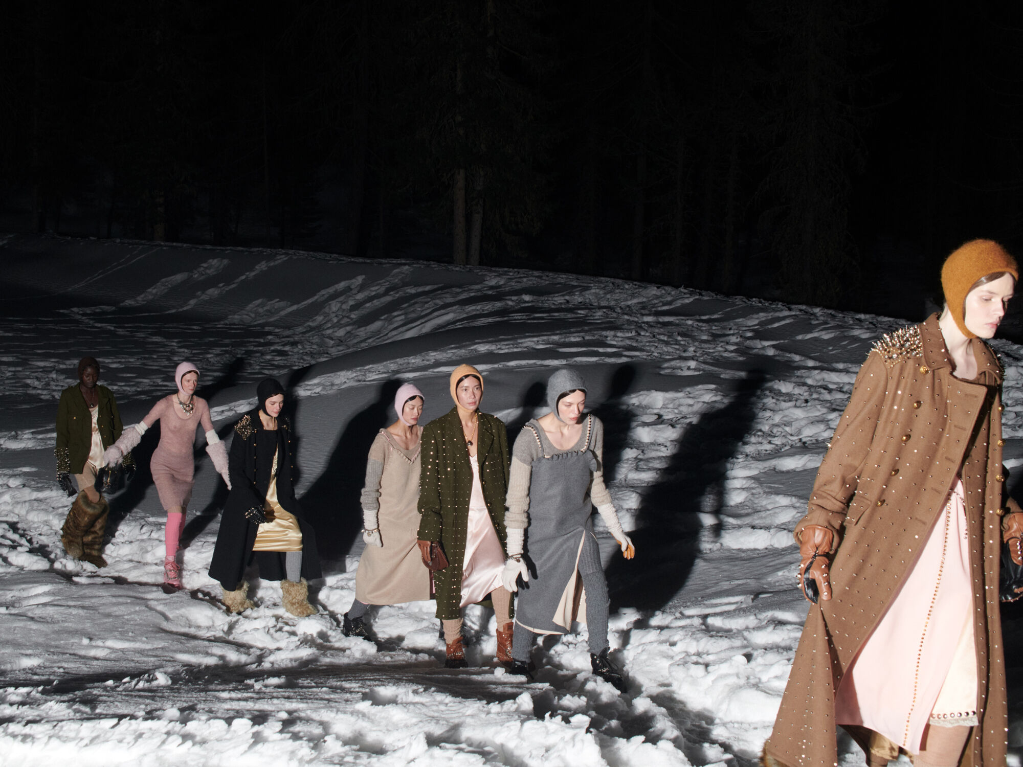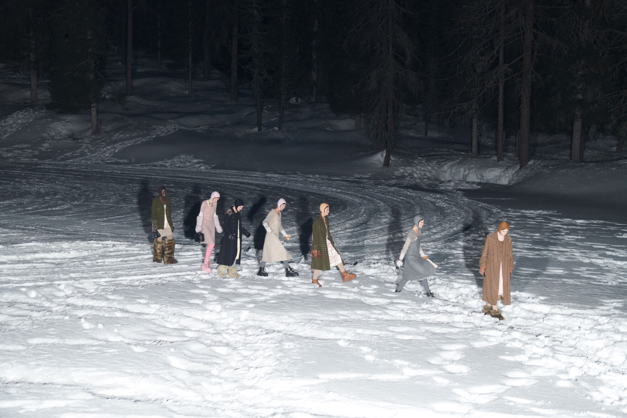 A surreal snowy landscape features multiple individuals walking, each dressed in stylized winter attire, including oversized boots and long coats. The scene, set against a backdrop of snow-covered slopes and towering evergreens, has a dramatic, dreamy quality. The figures are evenly spaced, their attire blending contemporary fashion with classic winter elements. Cold colors dominate the palette.