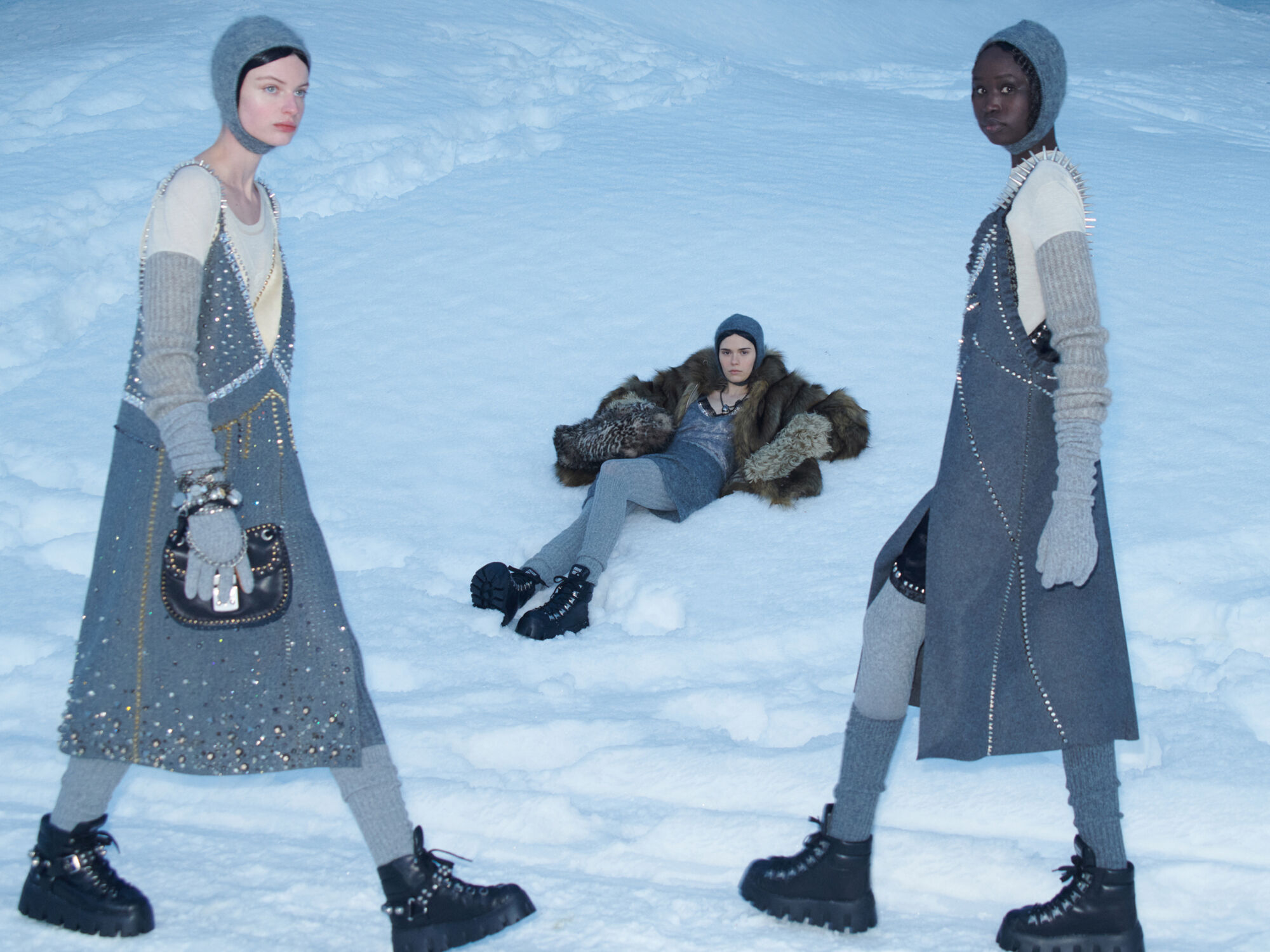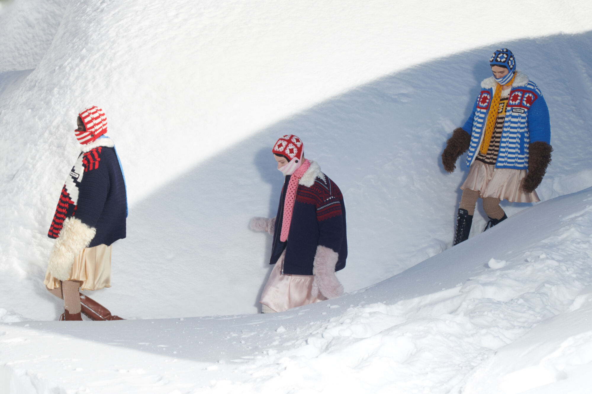 Three individuals are positioned on a snowy landscape. Two stand in the foreground, wearing long, gray, embellished outfits with matching knit headpieces and gloves. Black boots and a small handbag complement their attire. The third person, seated in the background, dons a fur coat and similar attire, adding to the wintry, stylish setting.