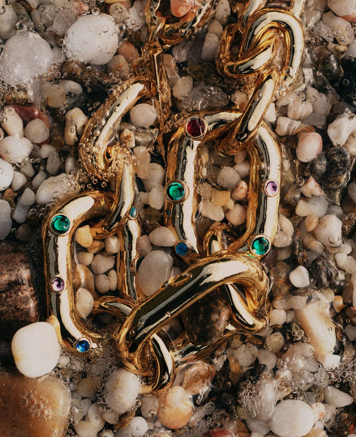 Golden chain links adorned with vibrant, colorful gemstones rest among smooth, wet pebbles. The stones range in color, including emerald green, deep blue, and rich purple. Bubbles cling to the metallic surface, enhancing its shine and creating a luxurious contrast against the muted, earthy tones of the surrounding rocks, suggesting a lavish, natural setting.