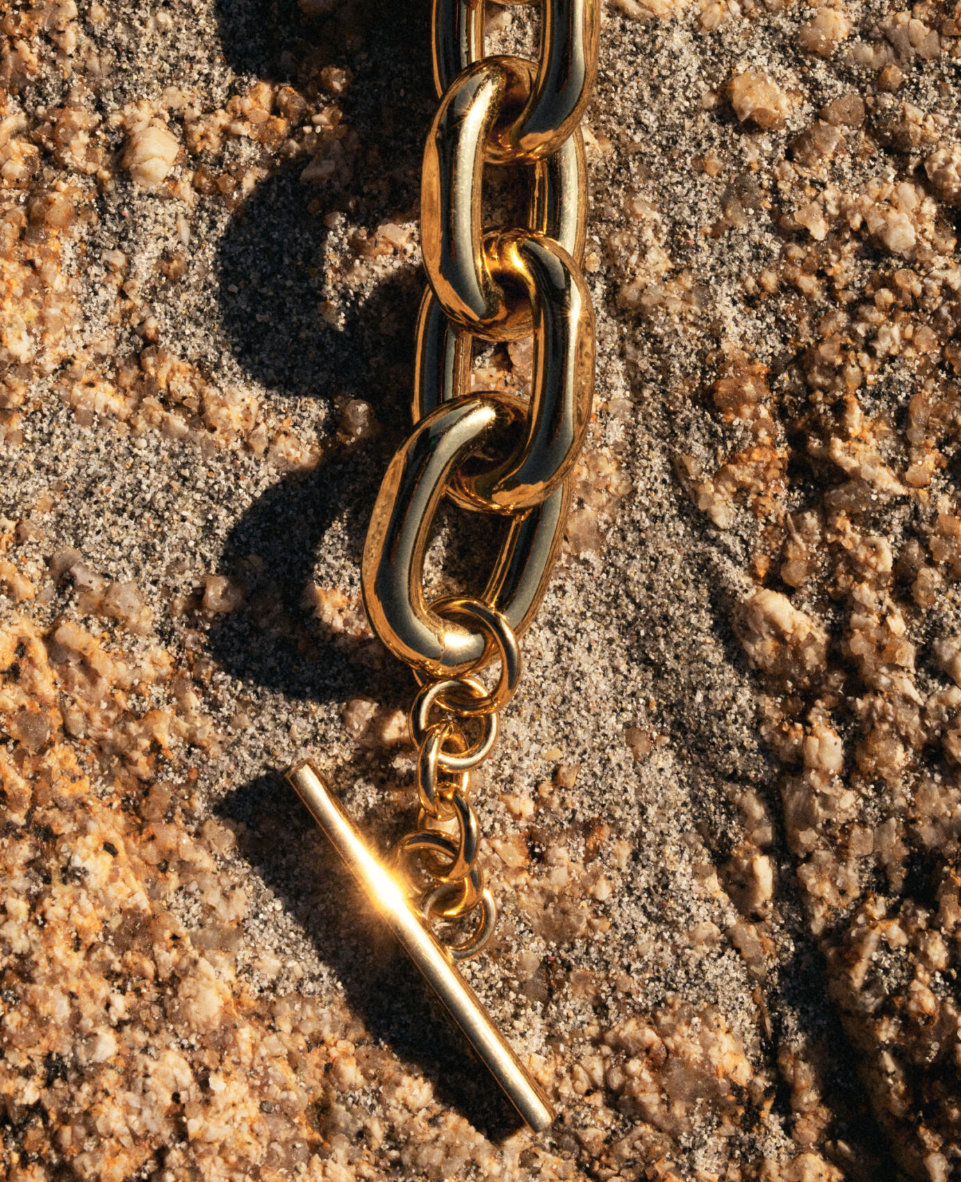 Golden, chunky chain links glint under direct sunlight, casting soft shadows on a textured, sandy surface peppered with small, rough stones. The polished metals form a T-bar toggle clasp, reflecting light brilliantly. This luxurious, gleaming piece stands out against the natural, earthy background in rich gold and beige hues, exuding elegance and sophistication amidst the rugged terrain.