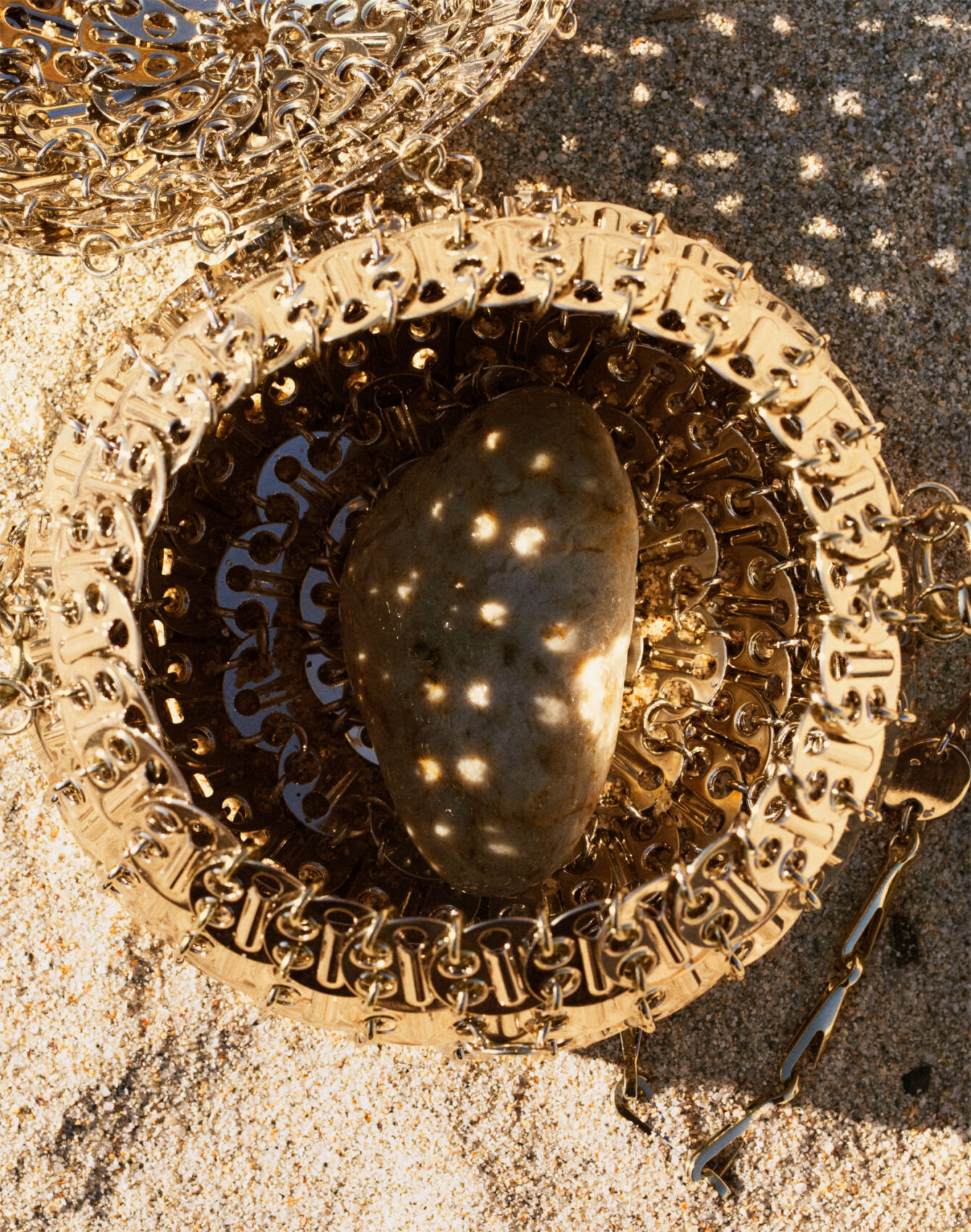 A rocky shoreline serves as a backdrop for an intricate metallic mesh structure. The mesh, circular and reflective, is adorned with linked components, encasing a smooth pebble at its center. Sunlight filters through, creating a patterned play of light and shadow. Surrounding grains of sand add texture, contrasting with the intricate metallic construction's ornate details.