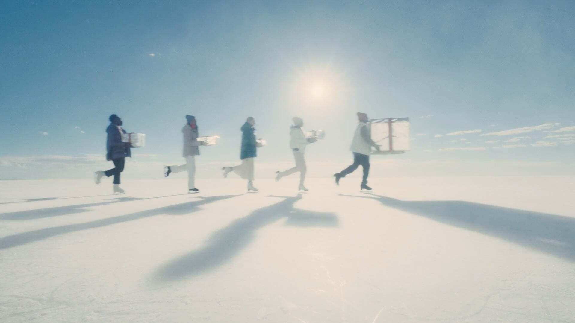 Figures skaters across a vast, white expanse under a bright, clear sky. Each figure carries a gift, and they appear to be moving at a brisk pace, creating a sense of motion blur. The overall scene evokes a feeling of joy, winter, and perhaps a festive occasion. The use of motion blur contributes to a dreamy, slightly surreal atmosphere.