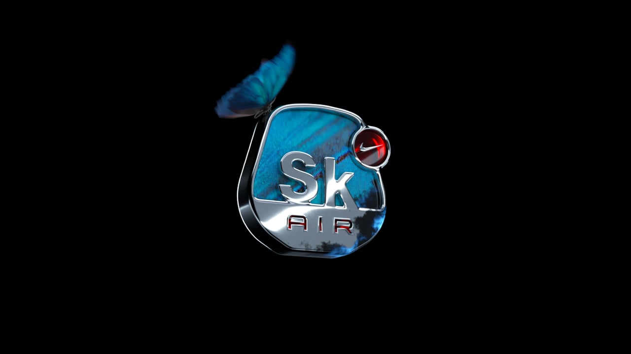 A sophisticated bottle of amber liquid stands elegantly against a serene, gradient background of soft blues and warm, peachy tones. The glass bottle features a distinct, ornate design with a reflective surface that mirrors the colors above. Flanking the central bottle, blurred reflections create a subtle, dynamic balance. The composition exudes luxury and refinement.