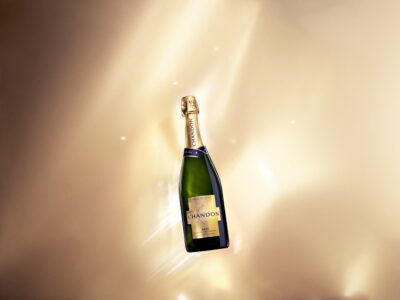 Three bottles of sparkling wine lie on a marble surface. Each bottle is elegantly designed, with gold foil wrapping the necks, accentuating their premium quality. The labels exhibit rich hues of deep green, black, and orange. Soft light casts gentle shadows, enhancing the luxurious ambiance and highlighting the subtle textures of their glass and the marble.