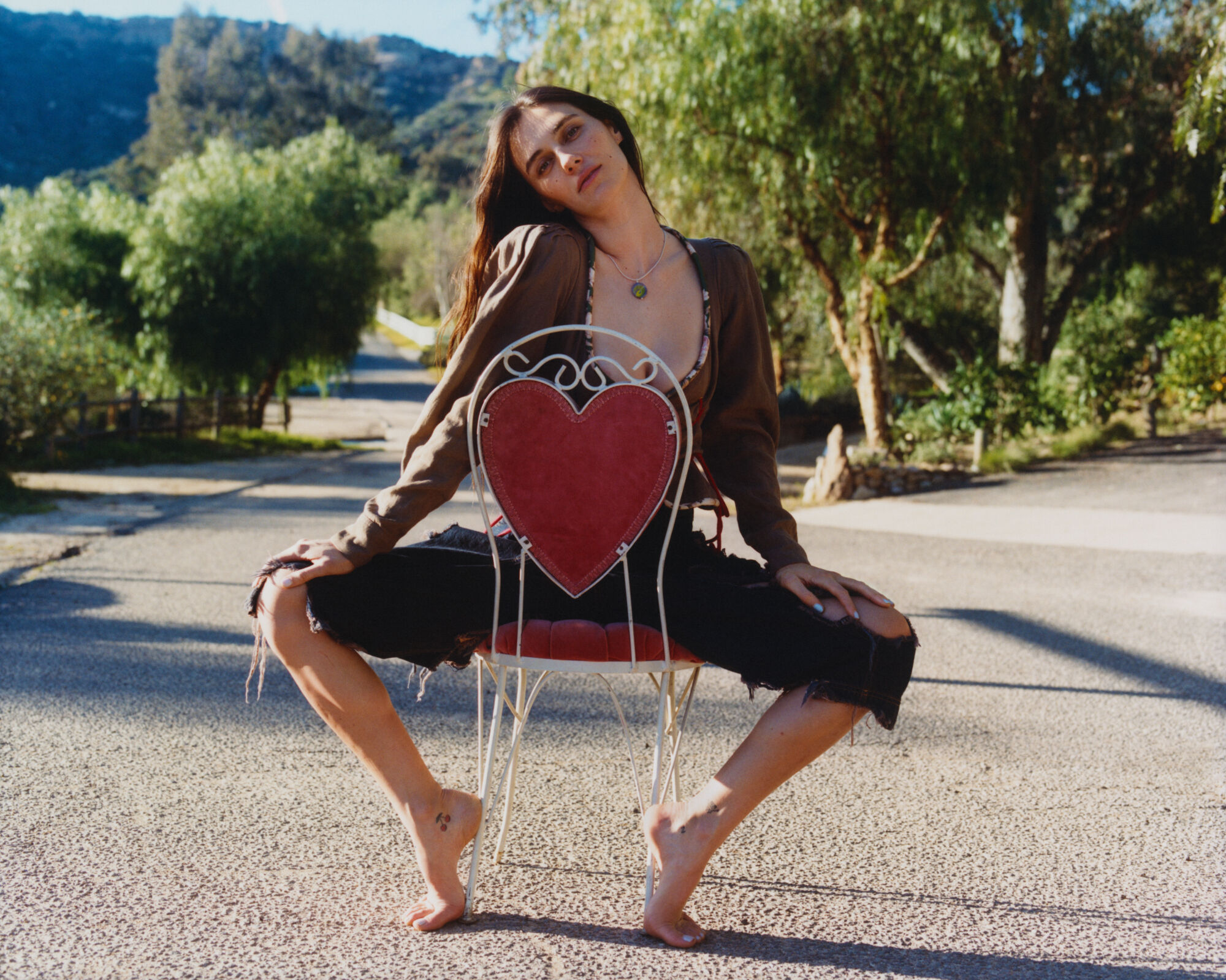 A person sits on a heart-shaped chair in an outdoor setting, surrounded by trees and a clear sky. The individual has long hair and is wearing dark pants and a brown top. Their pose is relaxed and confident, with bare feet resting on the ground. The background features a sunny path and distant hills.