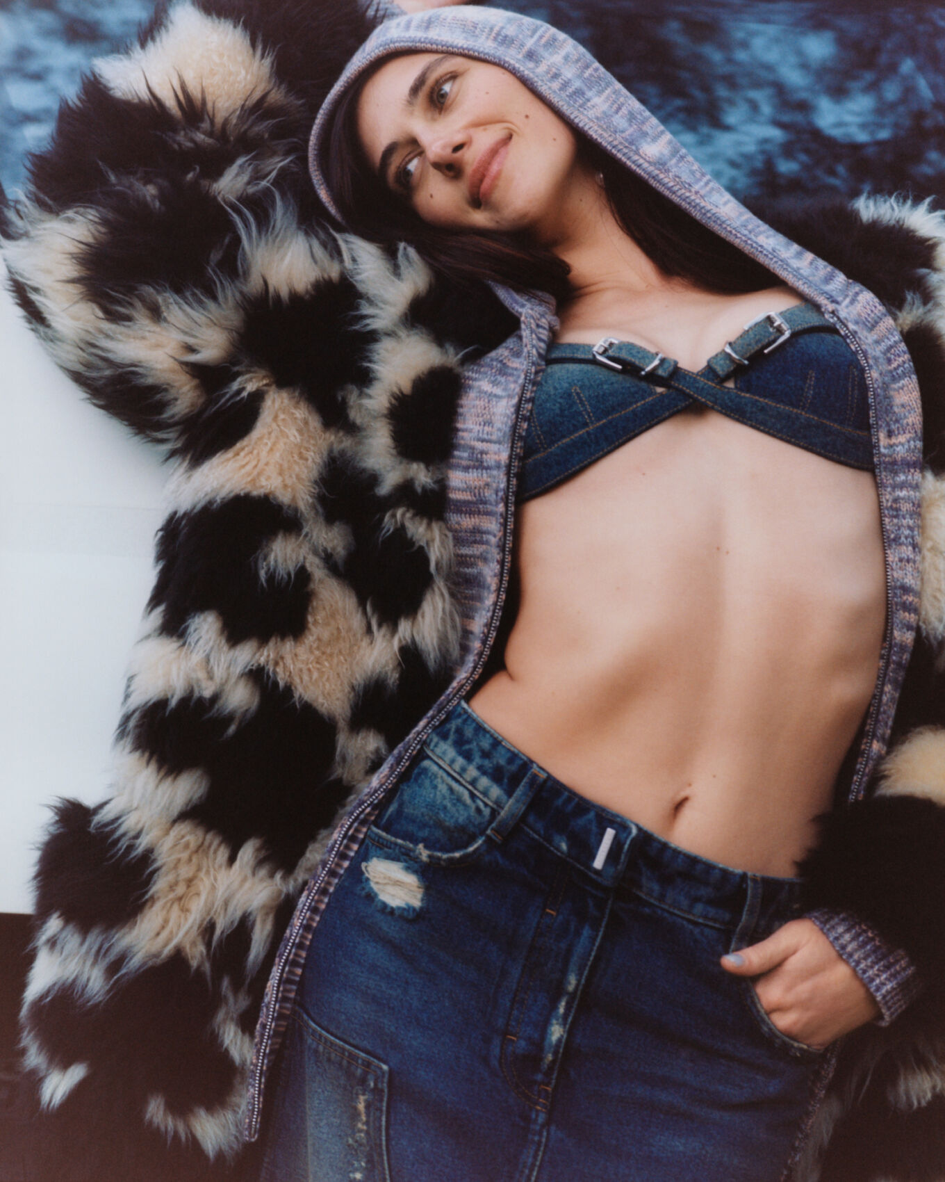 A woman stands confidently, wearing a denim top and high-waisted jeans with a distinctive styling. Her outerwear features a bold, fluffy coat with a mixed pattern, while a hoodie partially covers her head. She exudes a relaxed, stylish demeanor, her hand resting in her pocket, set against a softly blurred background in varying blue hues.