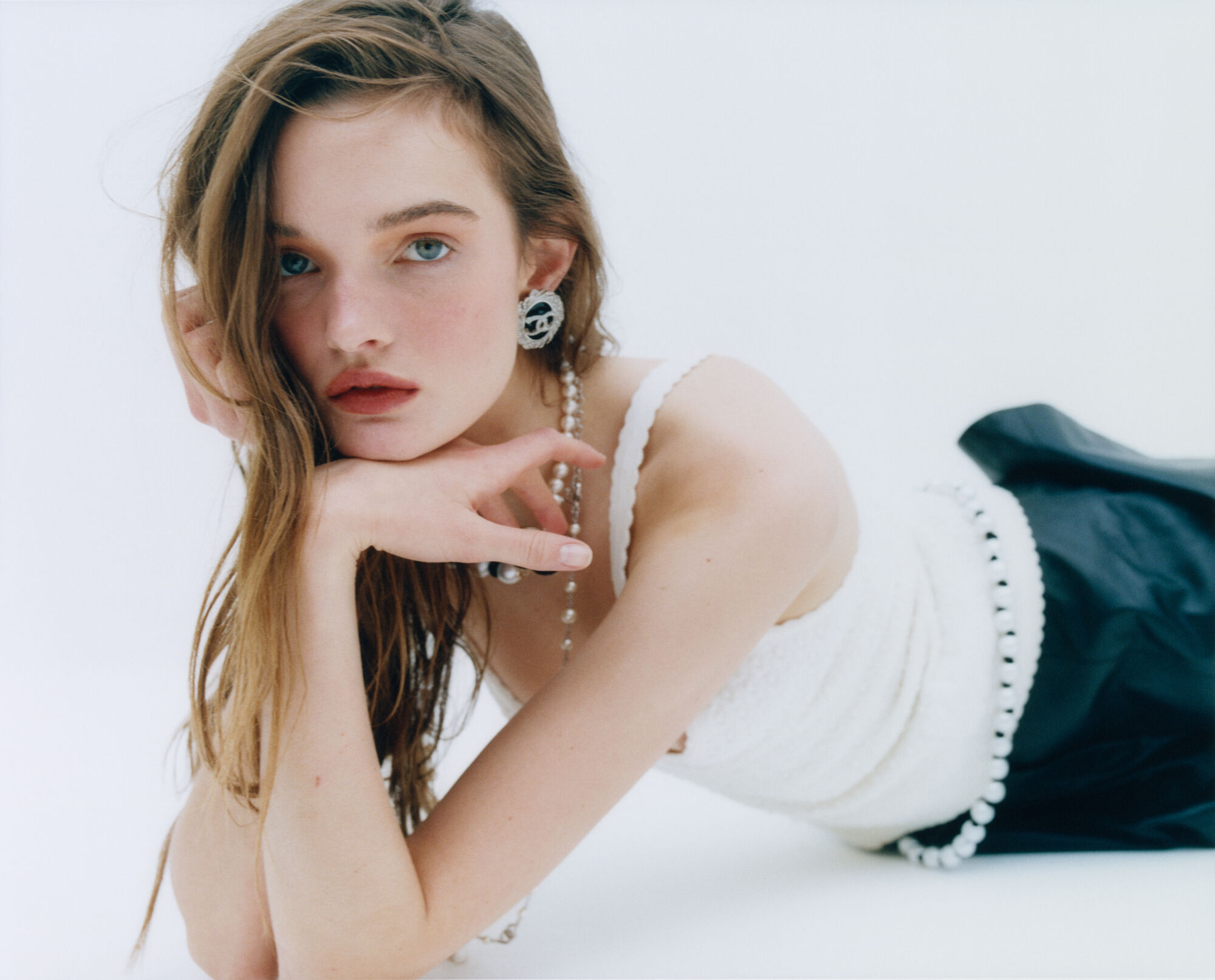 A person is lying down, gazing directly with an introspective expression. Long hair drapes naturally over one shoulder. They wear a textured top with thin straps and a dark skirt. Accessories include pearl jewelry and statement earrings. The background is soft and minimal, emphasizing an elegant and contemplative mood. The overall tone is serene and stylish.