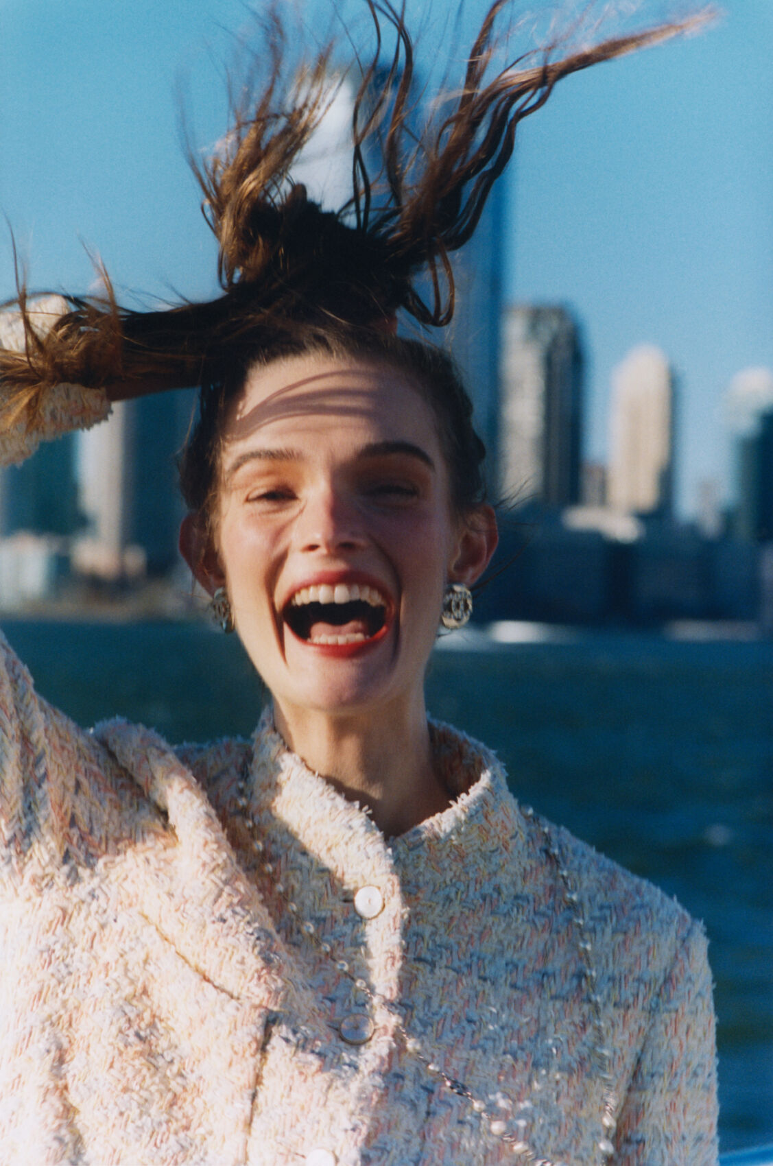 A woman with a big, joyful smile laughs openly in a dynamic, candid moment. Her hair is playfully tossed by the wind, and she wears elegant earrings and a tweed outfit adorned with a pearl necklace. The background reveals an urban skyline under a clear blue sky, highlighting a scene full of vibrant energy and happiness.