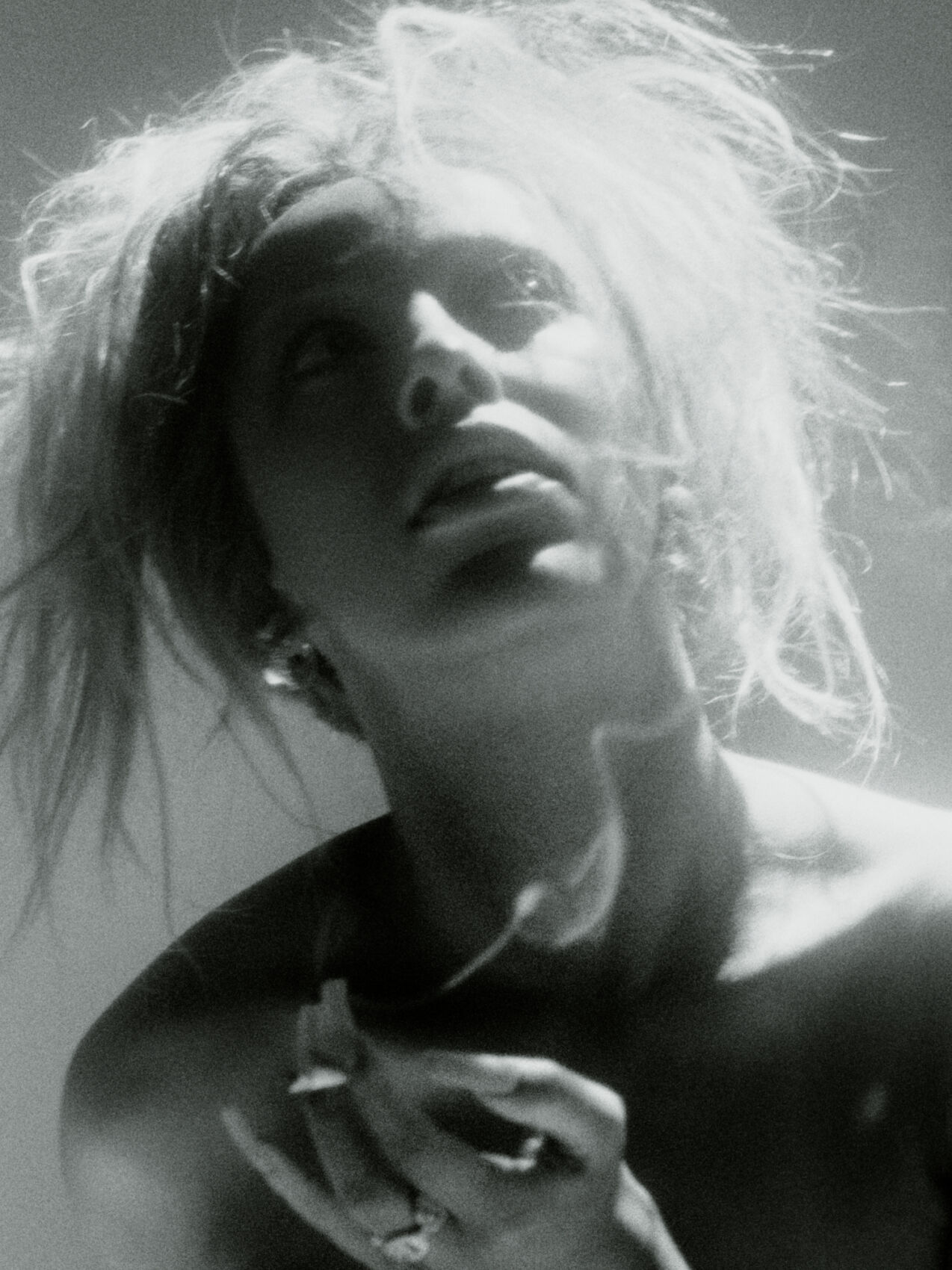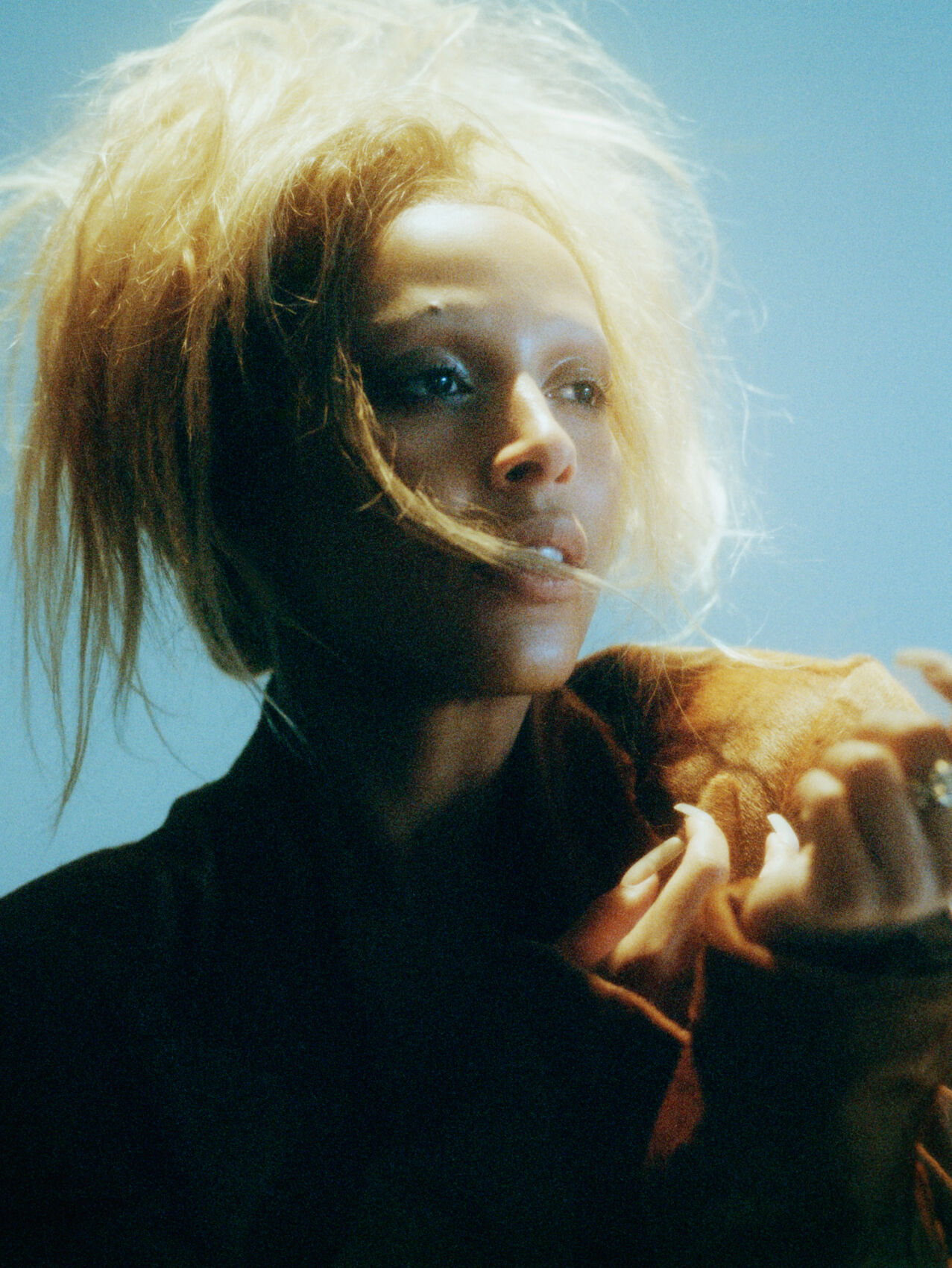 A person with light blonde, voluminous hair gazes thoughtfully upwards. Their face is softly illuminated, casting delicate shadows across their features. The background is a gradient of pale blue, creating an ethereal atmosphere. They're wearing a dark, textured outfit, with one hand partially visible, lightly poised against the chest. The composition conveys an introspective and serene mood.