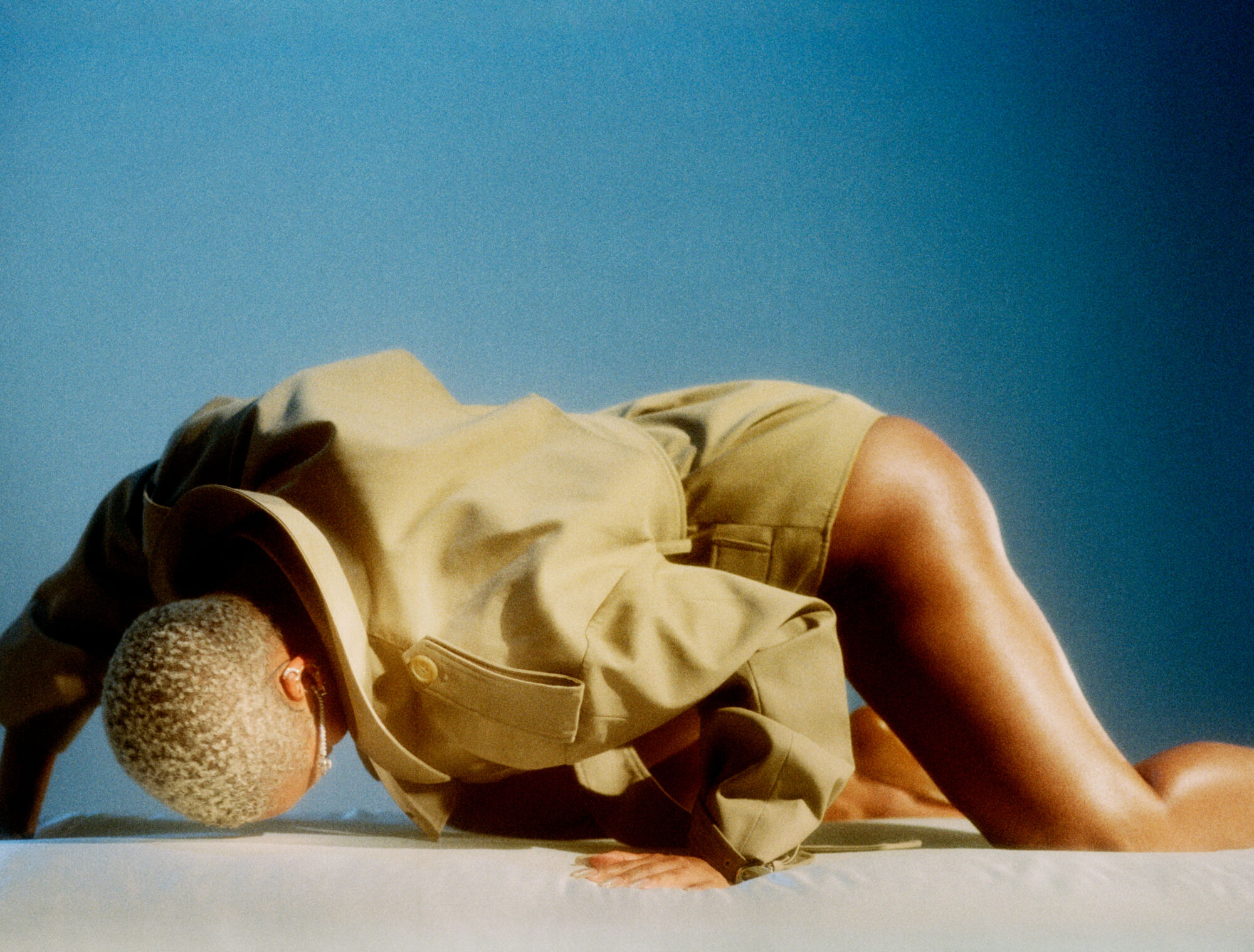 A person with short, light-colored hair is positioned in an elegant, dynamic pose on a neutral surface against a gradient blue background. They wear a stylish, tan jacket, with the fabric gently folding and catching ambient light. The scene exudes a sense of movement and contemporary fashion, highlighted by the shadows and soft, contrasting colors.