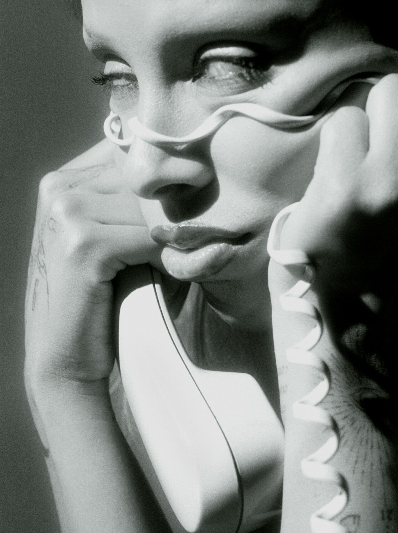 A close-up monochromatic composition shows a person holding a vintage telephone receiver to their face. A telephone cord is wrapped around their eyes, casting intricate shadows. Their expression seems contemplative, with tattooed arms resting on the face. The light accentuates the contrast between smooth skin and textured shading, creating an artistic, surreal atmosphere.