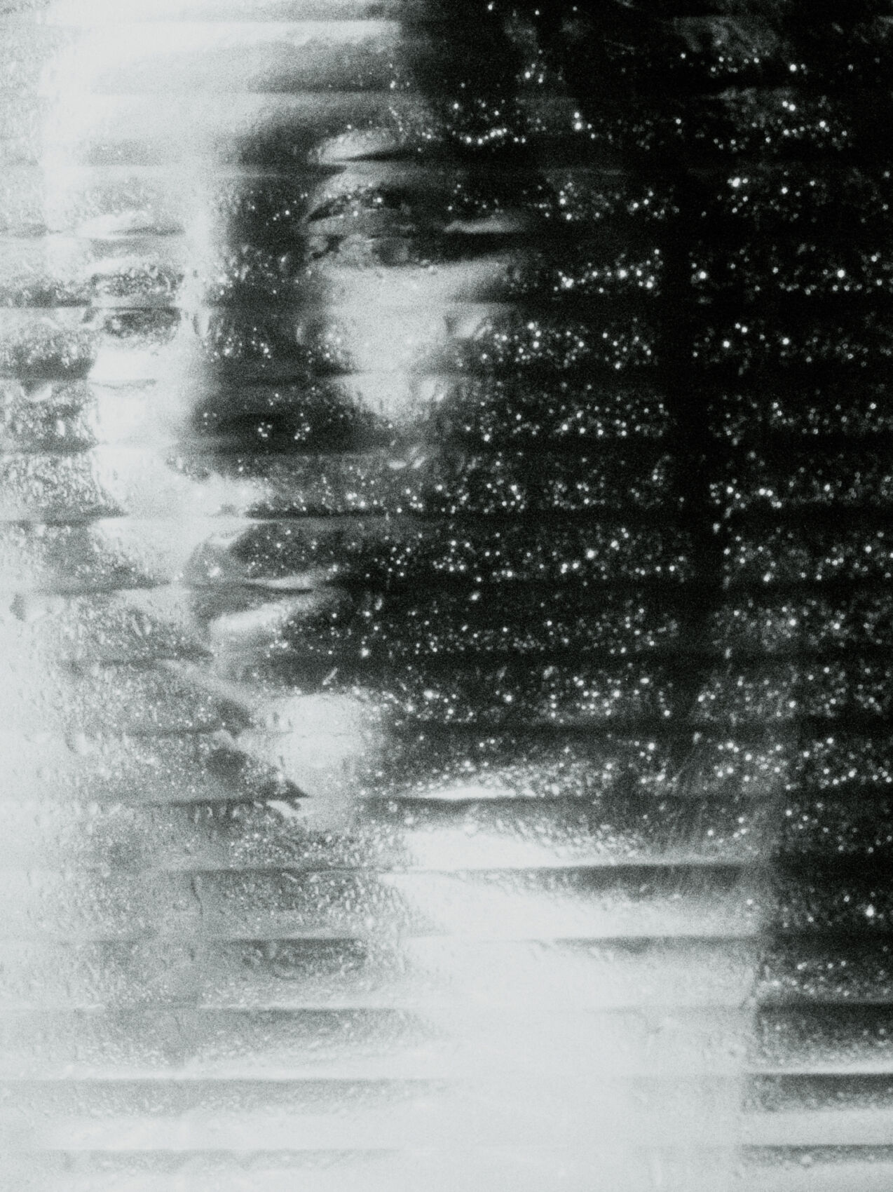 A barely visible face emerges through a wet, textured surface, illuminated by soft light. The scene is abstract, evoking a sense of mystery and introspection. The combination of shadows and highlights creates a monochromatic, dreamlike atmosphere. Drops of moisture distort the features, adding an element of depth and obscurity to the serene, contemplative expression.