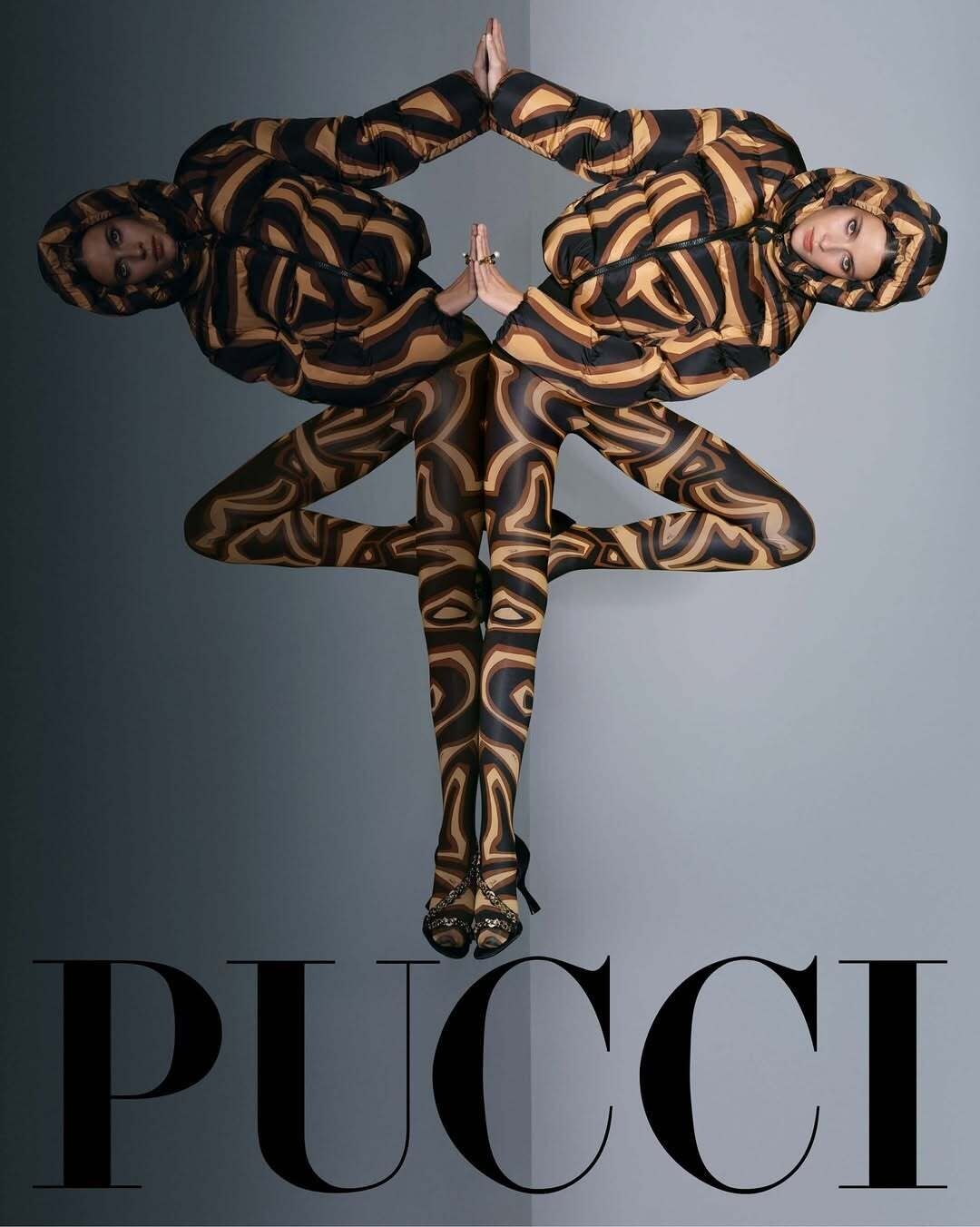 A mirrored figure forms a heart like silhouette through carefully posed arms and legs. The person wears a vibrant, padded hooded jacket and patterned leggings in swirling purples, reds, and greens. Their gaze is direct, makeup softly defined. The symmetrical composition feels graphic, playful, and sculptural, blending fashion with body geometry, rhythm, balance, bold colour, contemporary fantasy.
