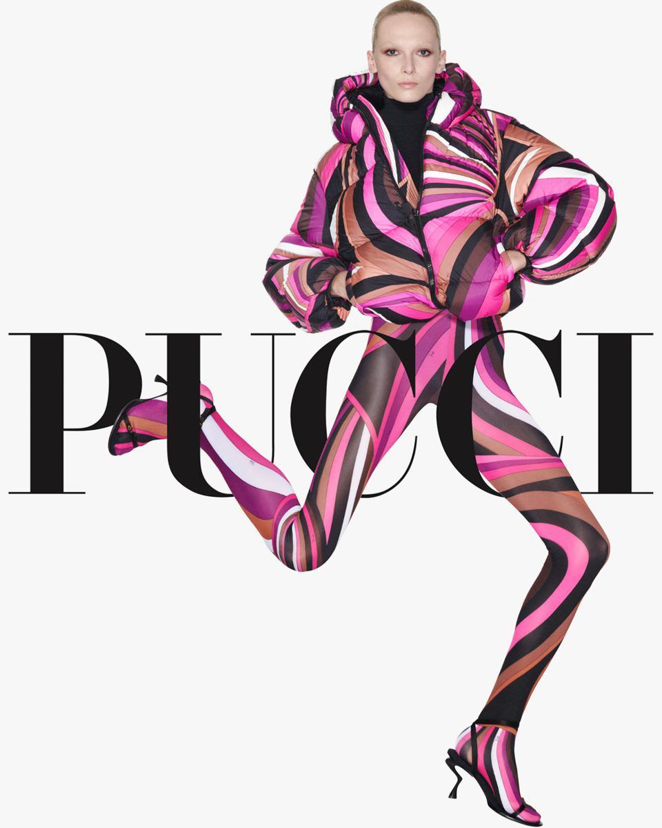 A person strikes a dynamic pose, wearing a vivid outfit featuring swirling, vibrant patterns in pink, black, white, and brown hues. The ensemble includes a puffy jacket and matching leggings, accentuating an energetic and bold style. The footwear consists of striking high-heeled shoes that complement the overall look, exuding a sense of modern, fashionable flair.