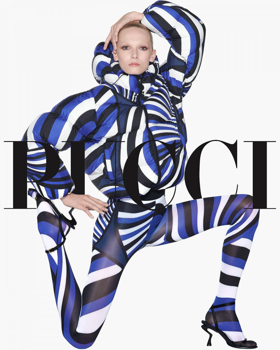 A person strikes a dynamic pose, wearing an outfit with bold, curvy stripes in blue, black, and white. The design features a voluminous, patterned jacket paired with matching form-fitting leggings and sleek, black stiletto heels. The overall aesthetic is modern and high-fashion, emphasizing geometric patterns and a confident stance against a clean, monochrome background.