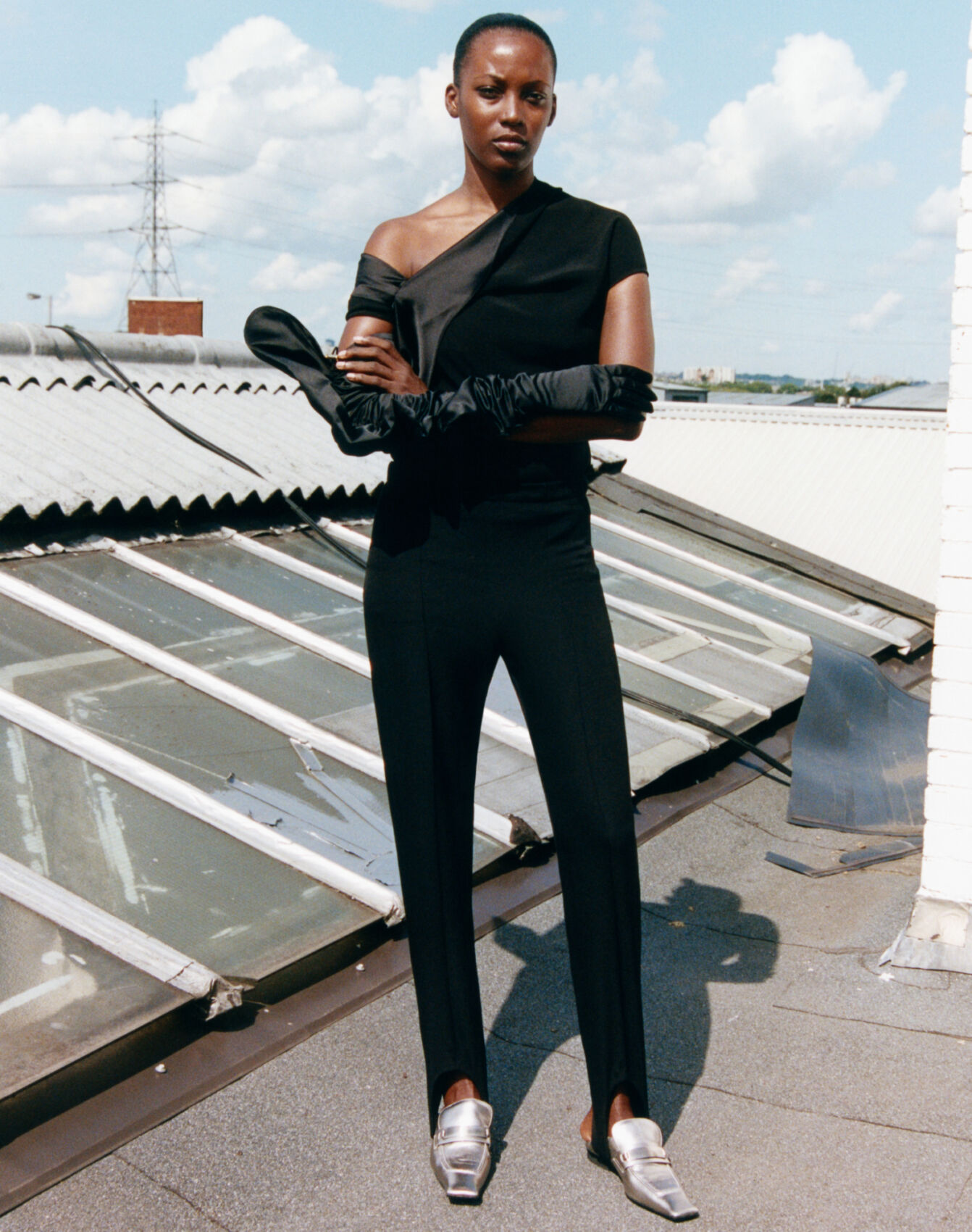 A person stands confidently on a rooftop, dressed in an asymmetrical black outfit with long gloves. The outfit has a single sleeve and is paired with metallic silver shoes. In the background, a cityscape with clouds and a transmission tower is visible, creating a juxtaposition between the urban environment and the stylish, futuristic attire.
