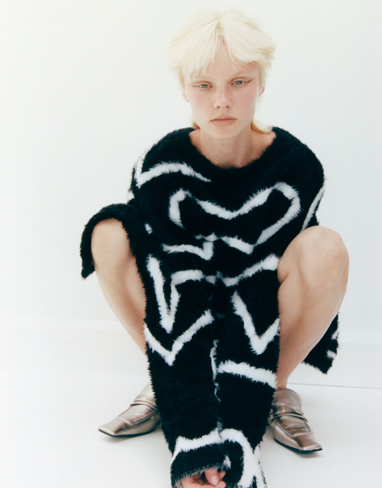 A person with short, light hair sits on a plain background. They are dressed in a bold, fuzzy black-and-white patterned garment that covers their arms and torso. Their feet are bare aside from metallic shoes. The expression is calm and introspective, and the overall composition highlights the texture and contrast of the attire against the light setting.