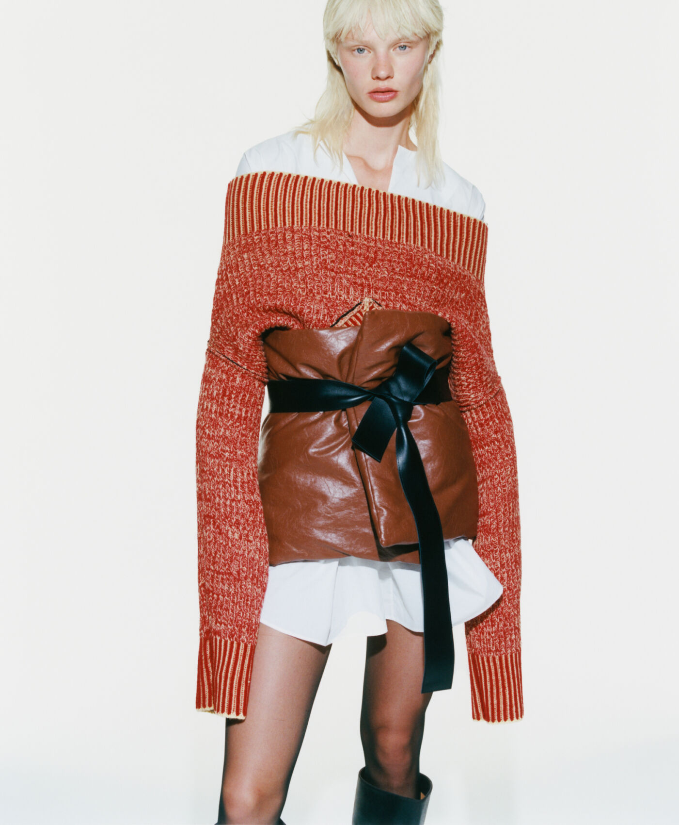 A person with light, shoulder-length hair wears a unique outfit combining a red, off-the-shoulder sweater with long sleeves, a brown leather waist jacket, and a black ribbon belt. Underneath, a white garment subtly peeks out. The overall look is edgy and fashion-forward, completed by knee-high black boots and a neutral expression. The background is plain white.