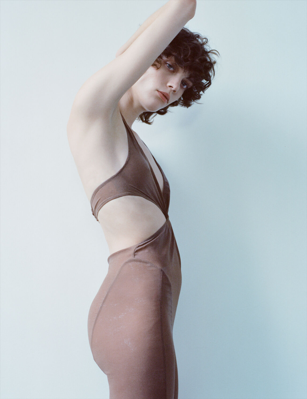 A person with short, curly hair poses against a pale background, wearing a form-fitting brown outfit with cut-out sections. One arm is raised, revealing a sleek silhouette and a contemplative expression. The minimalist setting and soft lighting highlight the texture and color of the clothing, creating a serene and stylish ambiance.