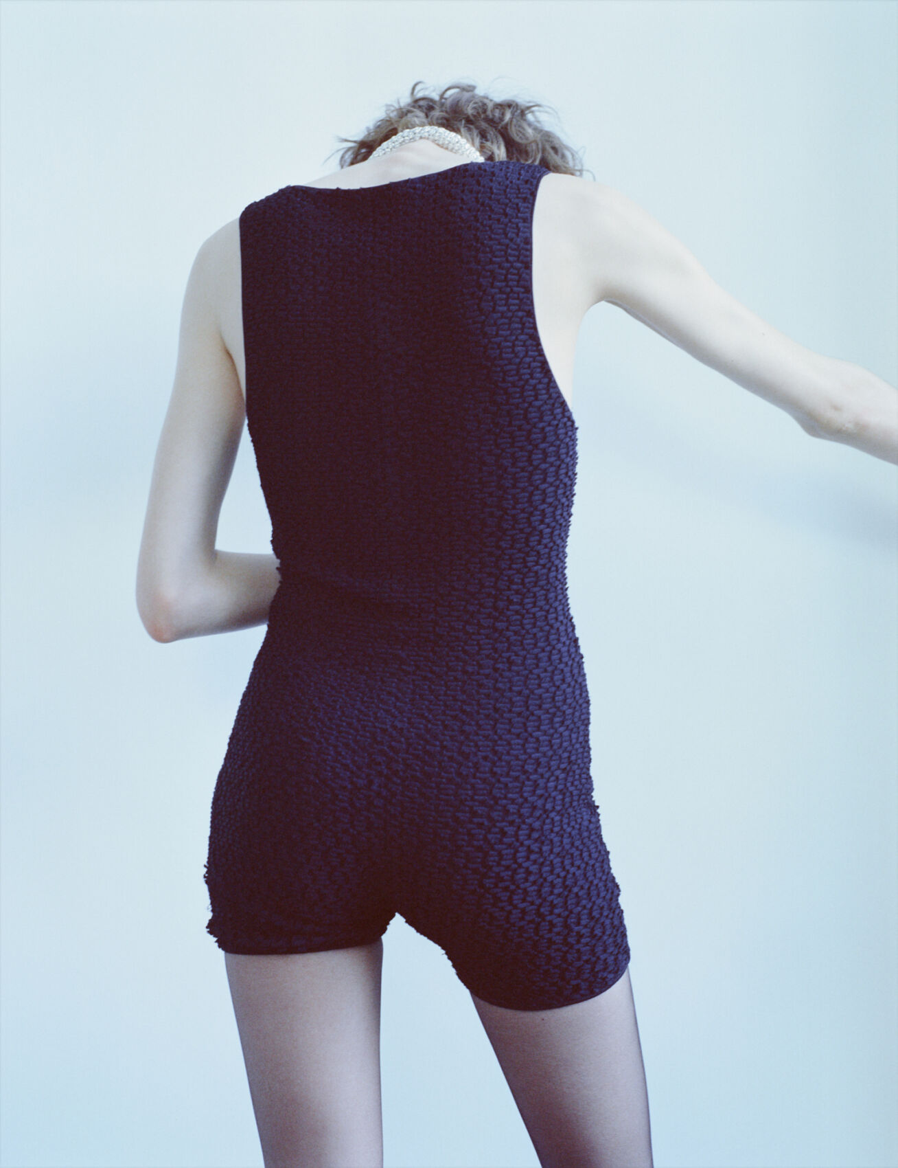 A person with short, tousled hair is wearing a textured black sleeveless outfit. The figure is captured from the back, with their arms slightly extended. The lighting creates a cool ambiance, accentuating the texture of the garment. The overall setting evokes a minimalist and modern aesthetic, with a focus on simplicity and style.