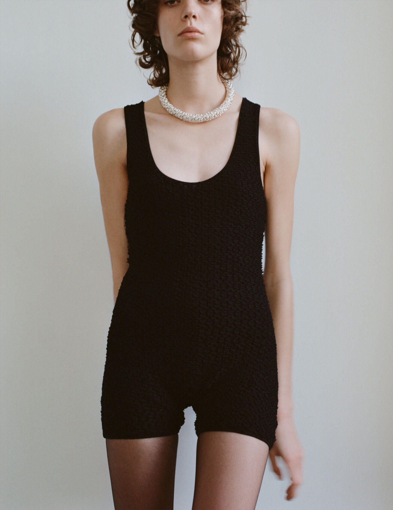 A person stands poised wearing a textured black sleeveless jumpsuit. Their hair is softly curled, and they adorn a statement piece, a large, elegant pearl necklace. The minimalistic background enhances the simplicity and sophistication of the outfit, drawing focus to the person's confident posture and the intricate detailing of their ensemble.