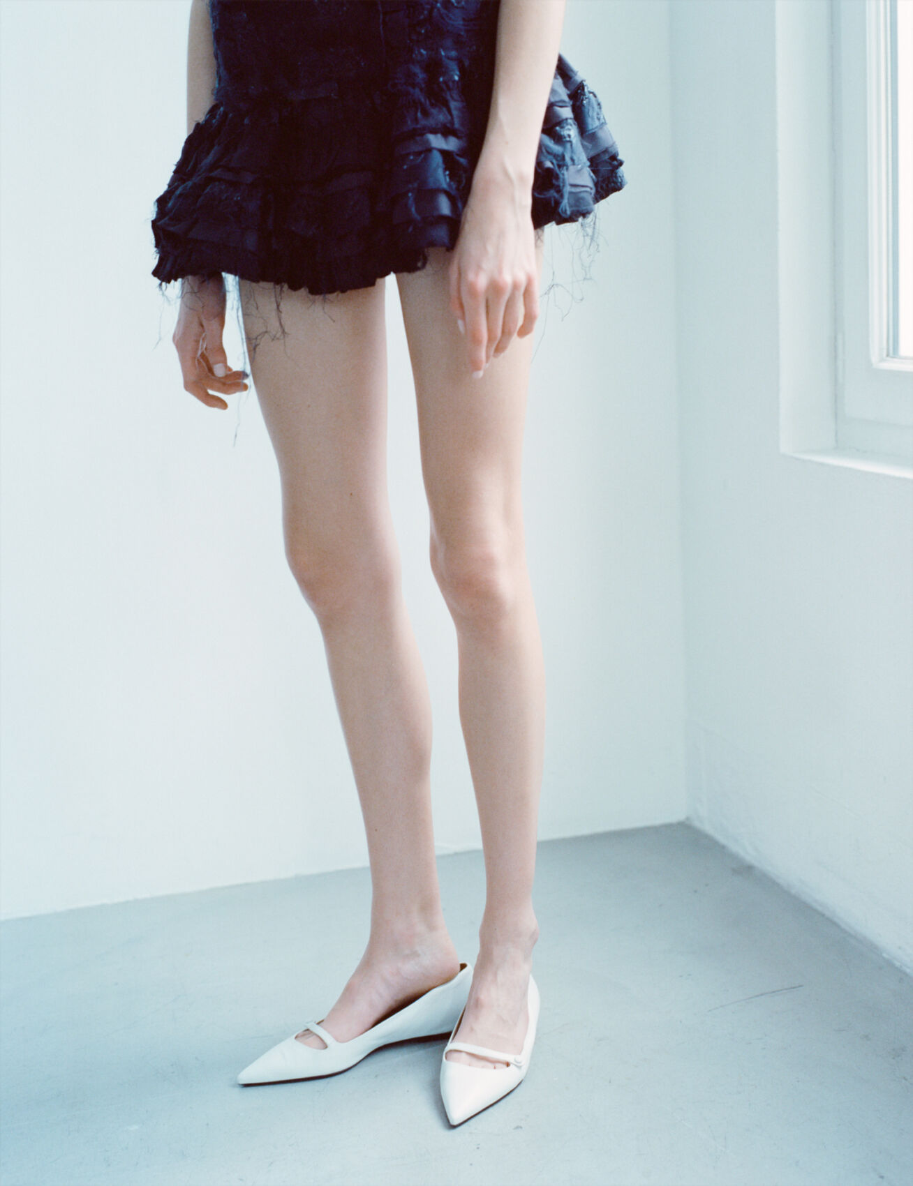 A person stands on a light gray floor, with white pointed shoes. They're wearing a dark, layered, frayed mini dress that contrasts with the minimalist surroundings. Their lightly tanned skin is visible from the thighs down, and their arms hang naturally by their sides. Natural light enters from the right, suggesting a window nearby, adding a soft glow.
