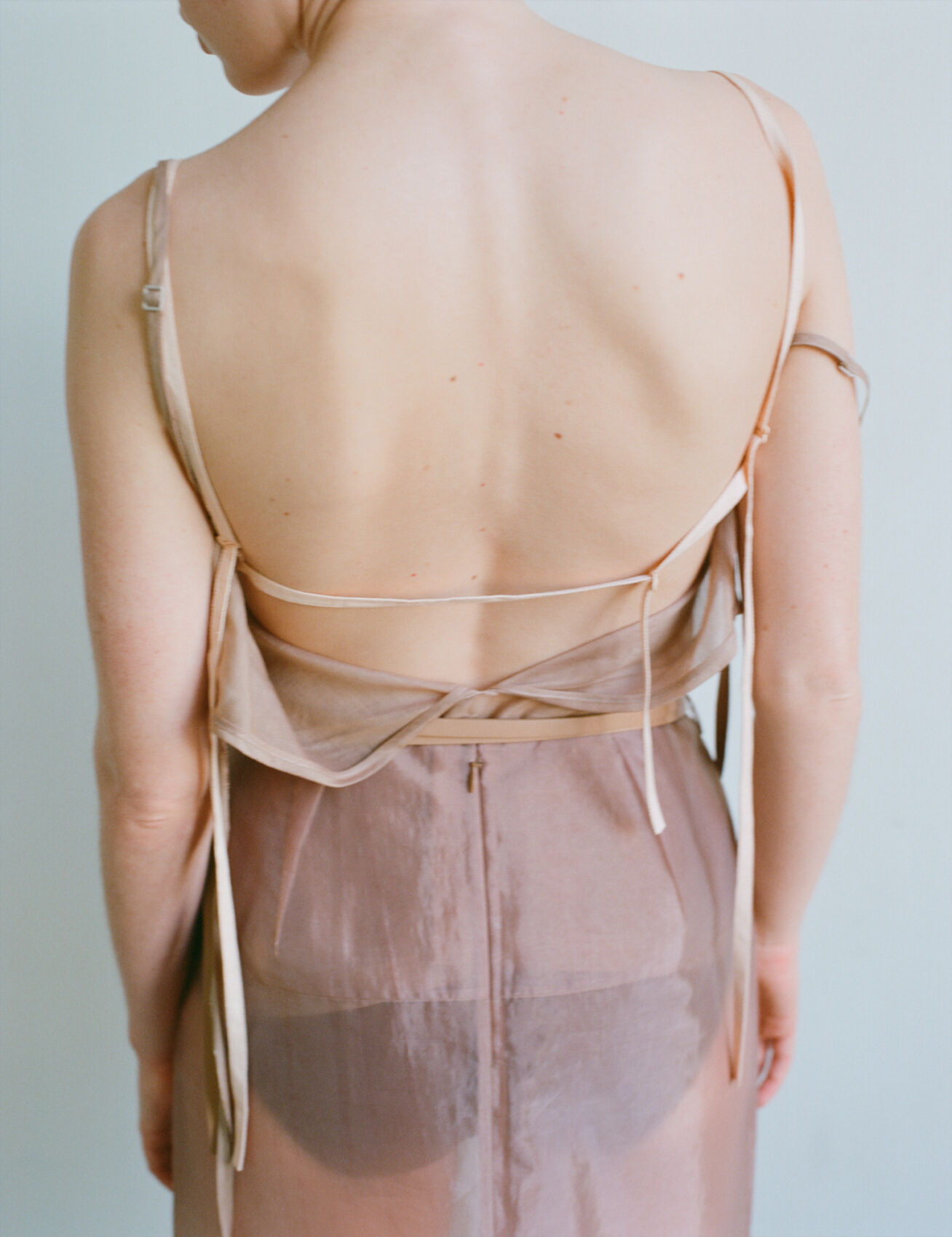 A person stands with their back to the viewer, wearing a delicate, sheer dress. The garment features thin straps and flows elegantly downwards. The skin is illuminated softly, showcasing a gentle natural tone. The overall scene exudes serenity and subtlety, highlighting the intricate texture and design of the fabric against the person’s bare skin.