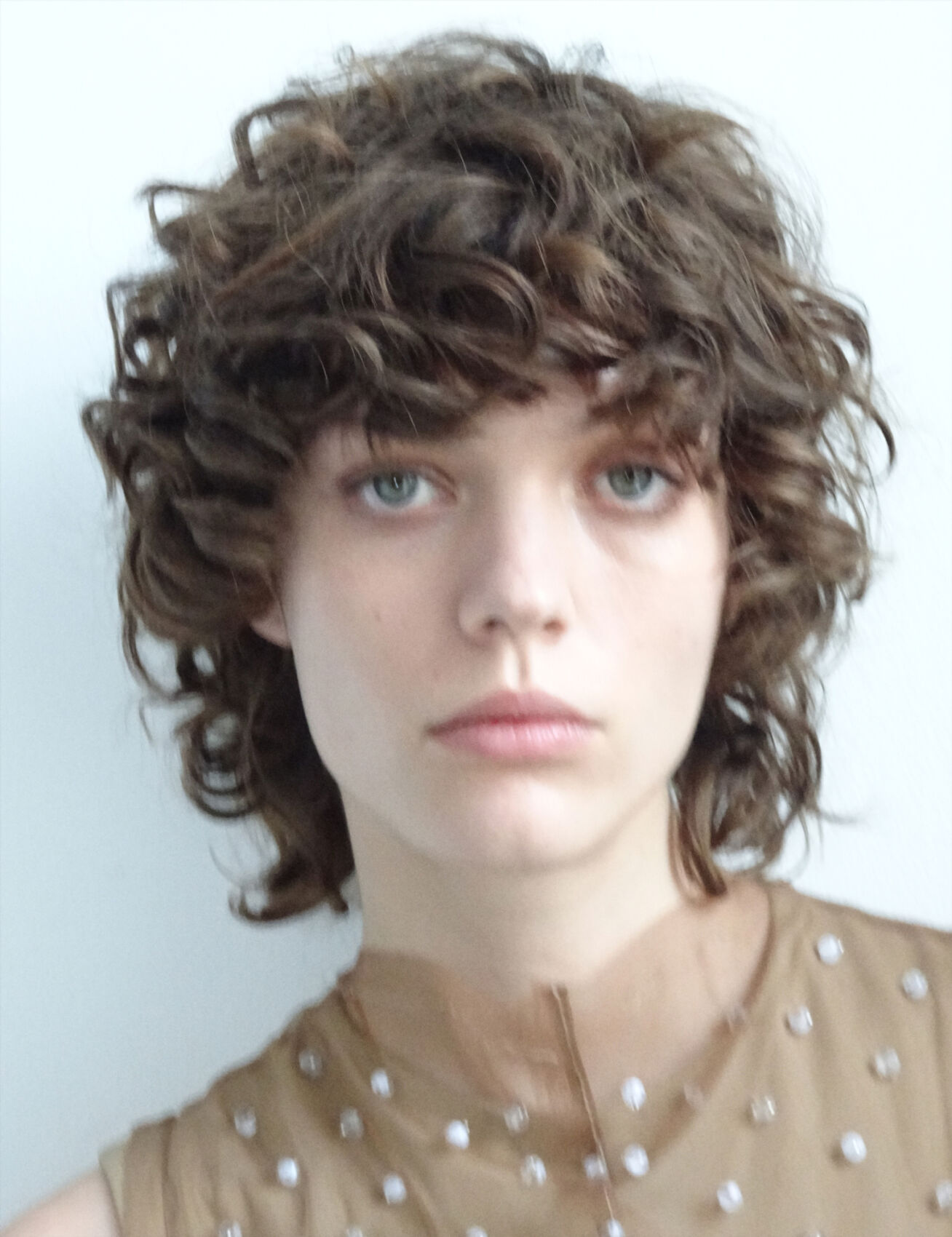 A person with short, curly brown hair is seen on a light background. They have light blue eyes and are wearing a sleeveless garment adorned with small, shiny embellishments. The expression is neutral, with a slightly tilted head. The lighting is soft, highlighting the texture of the hair and the details of the fabric.