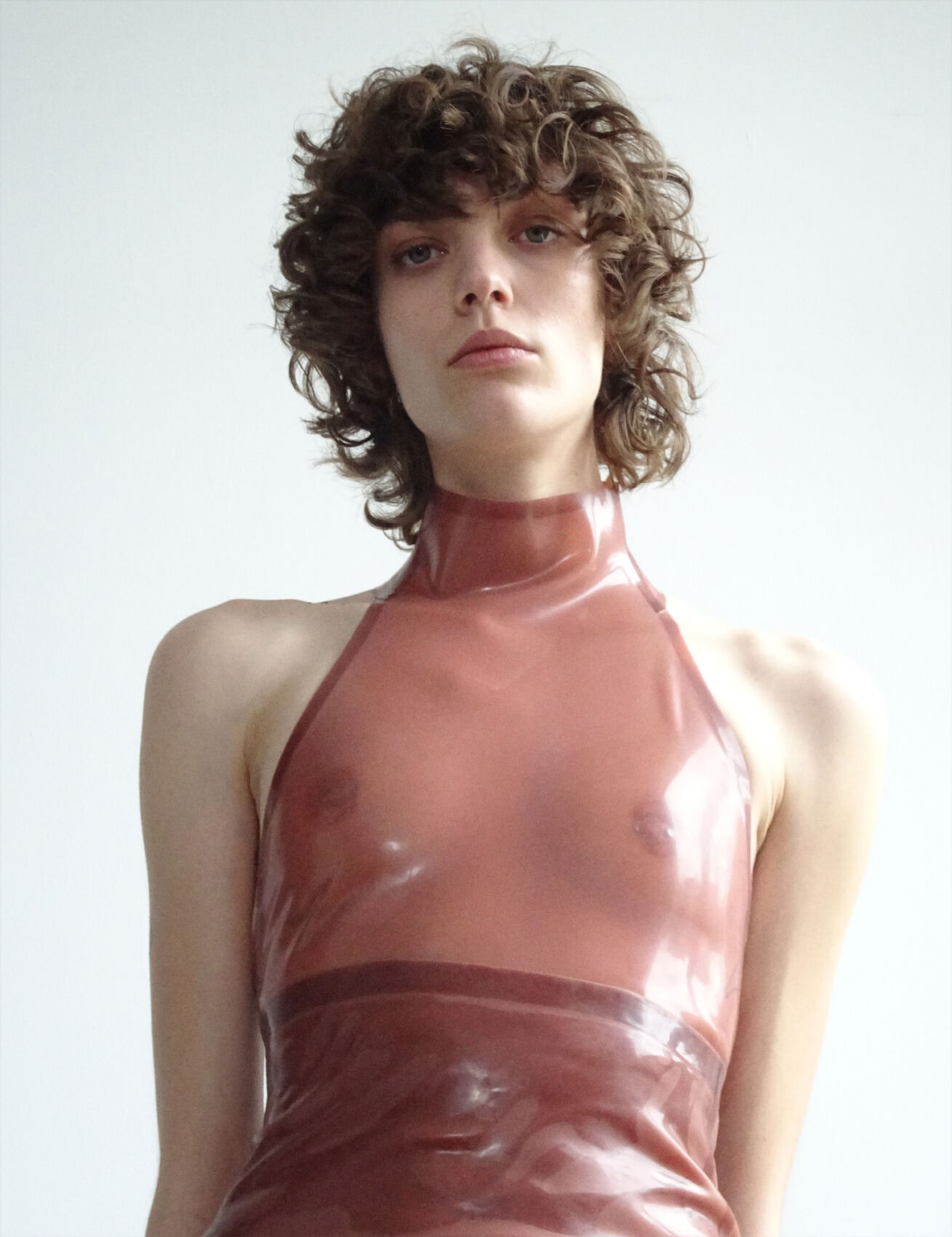 A person with curly, brown hair gazes directly ahead, exuding a sense of calm confidence. They're wearing a high-neck, semi-transparent outfit with a halter design, made of a shiny material in a brownish hue. The background is simple and unadorned, emphasizing the focus on the individual's poised and serene expression. The overall atmosphere is modern and minimalistic.