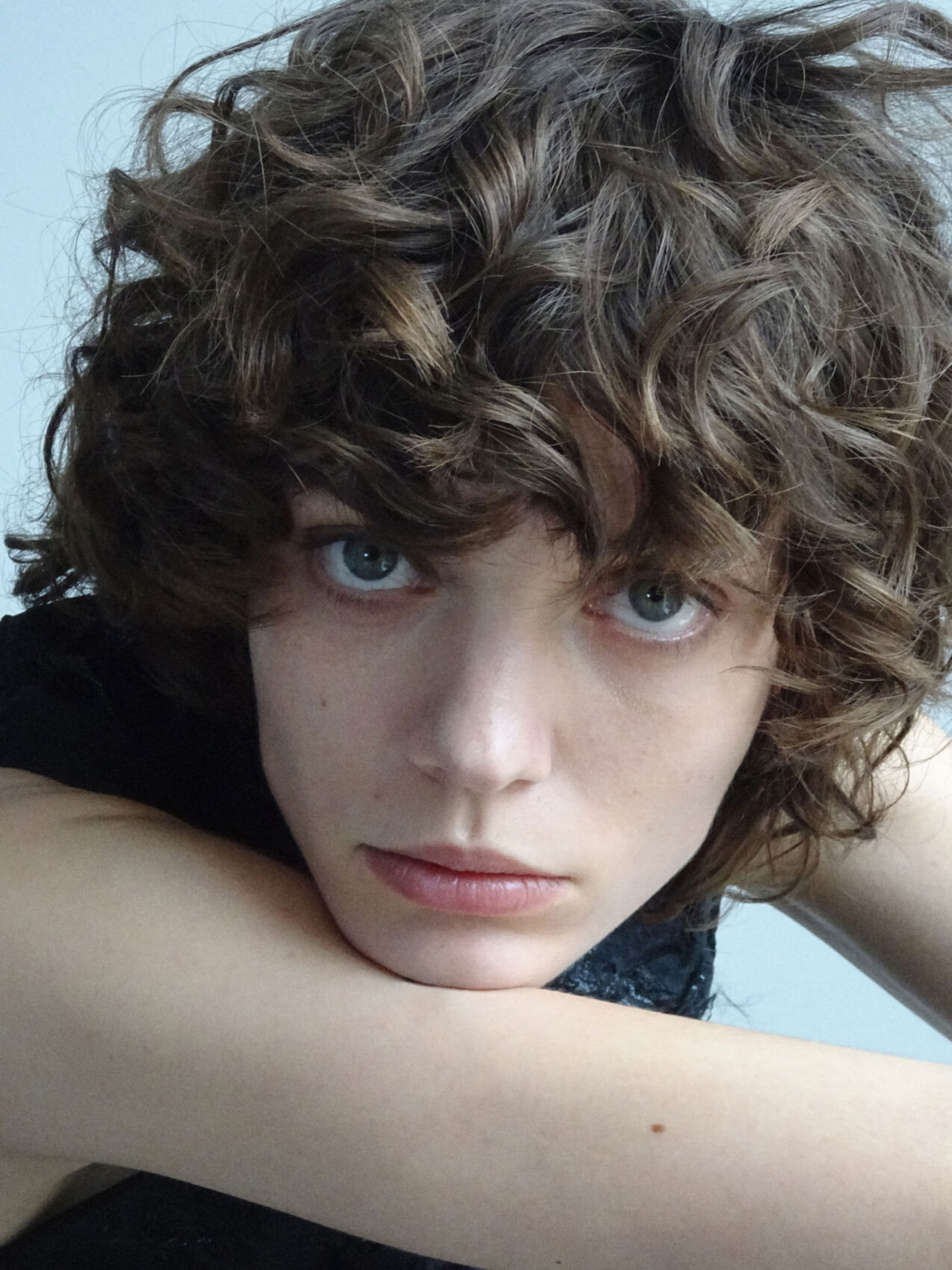A person with curly, tousled hair gazes directly with a neutral expression. Their head rests on their arm, creating a relaxed pose. The lighting is soft, highlighting their features and the texture of the hair. The background is simple and unobtrusive, allowing focus on the person's thoughtful demeanor and expressive eyes.