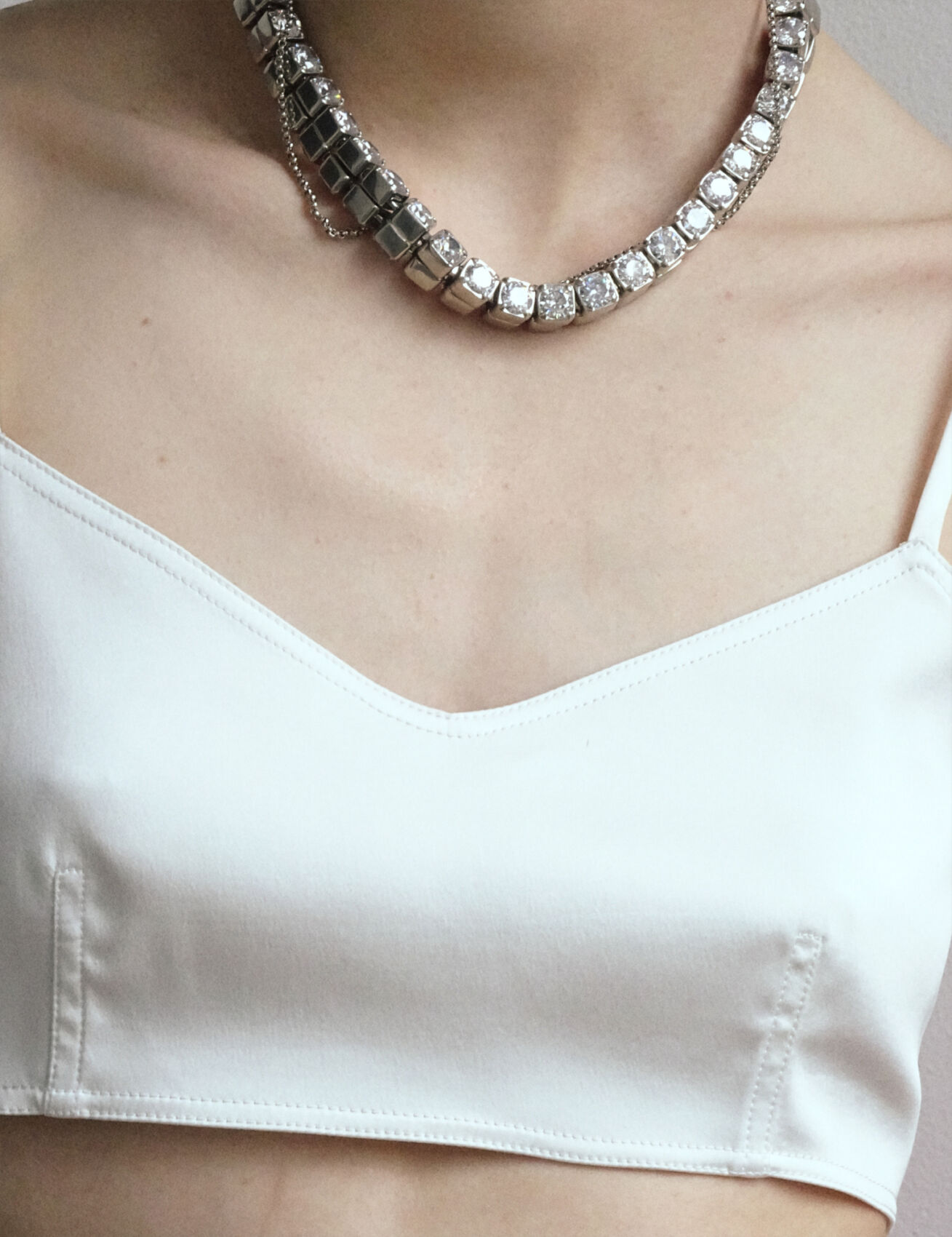 A person stands with their back facing the observer, gently leaning against a white surface. They wear a white strap top with intricate fastening and bright pink pants. The person’s shoulder-length hair curls slightly, and they have delicate jewelry around their neck. The soft natural light enhances the minimalist and serene atmosphere, highlighting the details and textures of the clothing.